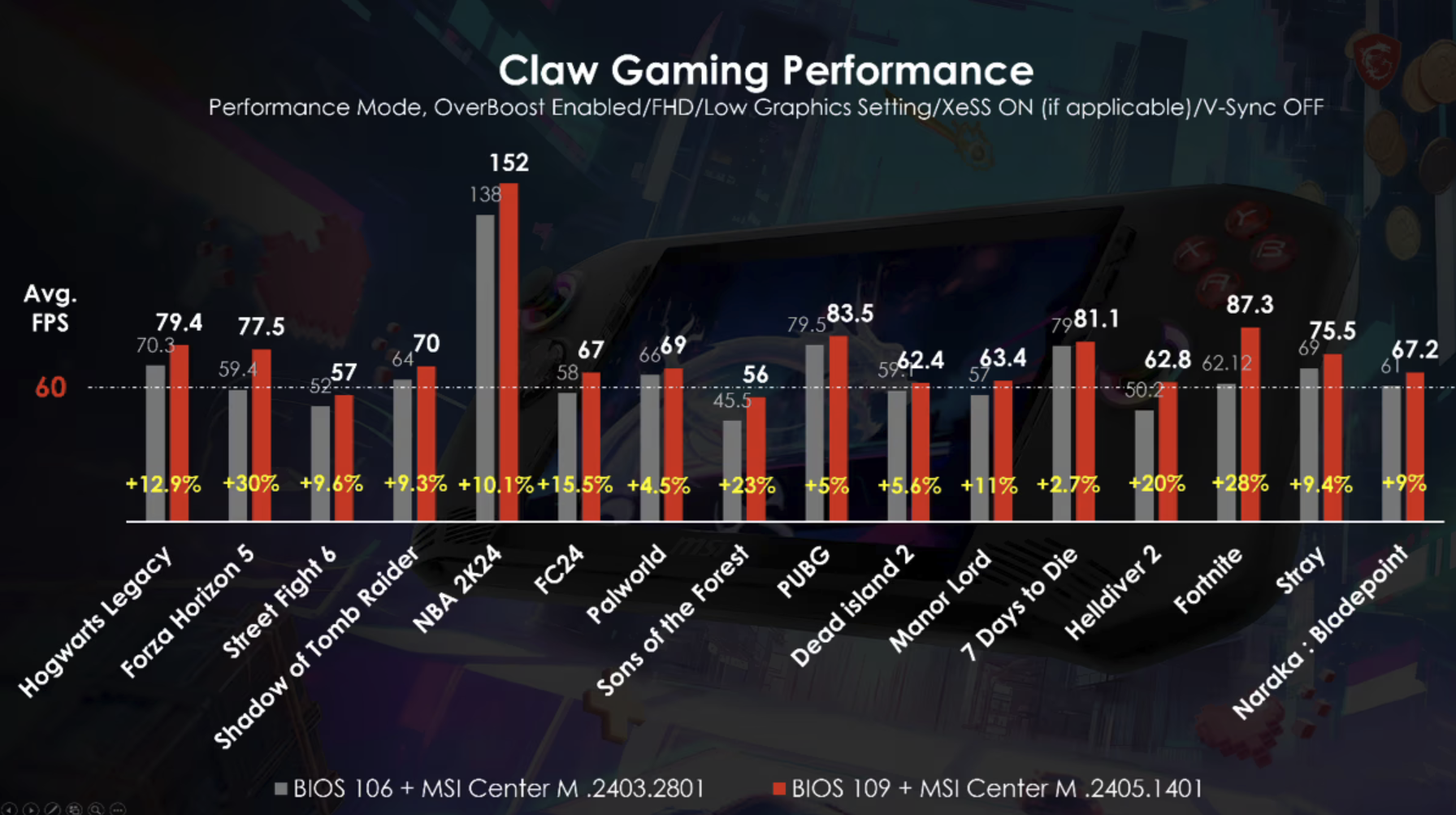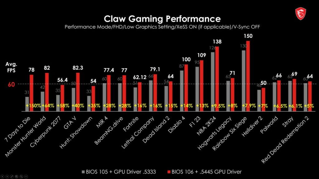 Das neue E1T41IMS.106 BIOS (bezeichnet als 106) und der 31.0.101.5445 GPU-Treiber (bezeichnet als 5445) für die MSI Claw haben laut internen Tests die Spieleleistung deutlich verbessert. So wurde beispielsweise bei dem bekannten Open-World-Survival-Hit „7 Days to Die“ eine Performance-Steigerung um bis zu 150% erreicht. Bei anderen beliebten Spielen wie „Monster Hunter World“ und „Cyberpunk 2077“ brachten die neuen BIOS- und GPU-Treiber Leistungsverbesserungen von über 50 %.