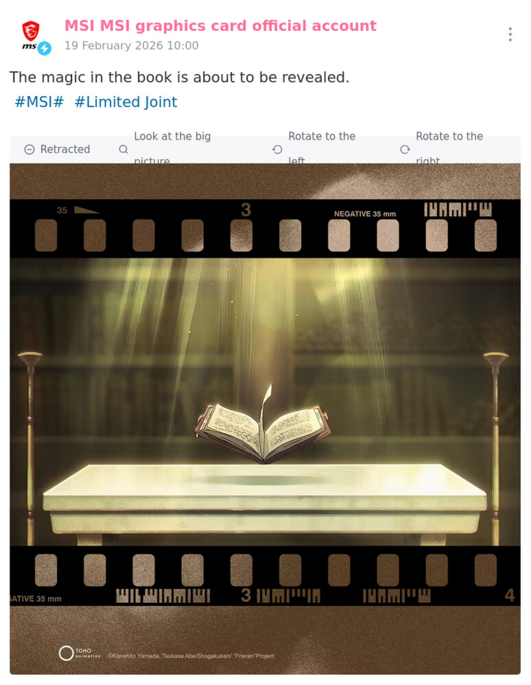 MSI deutet eine neue Sonderedition-Grafikkarte in Zusammenarbeit mit dem Anime Frieren: Beyond Journey’s End an. In einem Beitrag auf Bilibili kündigte der Hersteller eine limitierte GPU an, Details zum Modell gibt es bislang jedoch nicht.