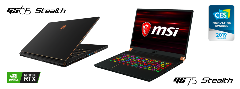 MSI GS Stealth Serie: Das Highlight der neuen MSI Laptops stellt ohne Zweifel die GS Stealth Serie dar. Ein 17,3“-Notebook mit einem lediglich 19 Millimeter dünnen Aluminium-Gehäuse und nur 2,2 kg Gewicht in Verbindung mit einer leistungsstarken GeForce RTX-Grafik bis hin zum 2080 Topmodell ist ein absolutes Novum. Ebenfalls verfügbar ist der besonders kompakte und 1,9 kg leichte GS65 Stealth mit einem 15,6“-Display, der in der Maximalausstattung ebenfalls über eine RTX 2080 verfügt.