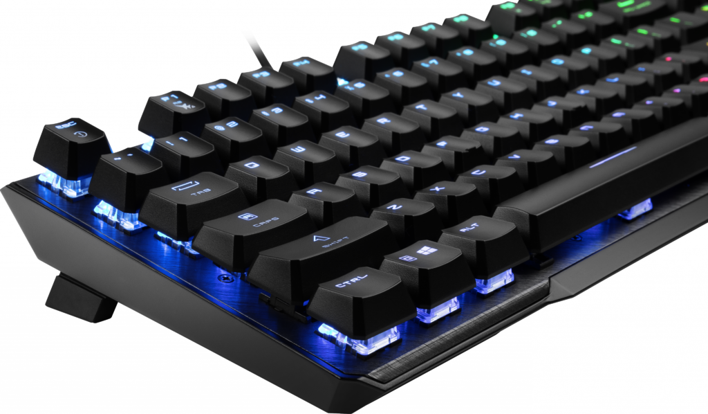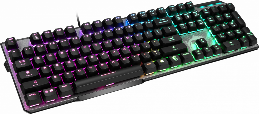 Ein gebürsteter, eloxierter Rahmen aus Flugzeugaluminium macht die Tastatur extrem stabil und bietet eine solide Basis für intensivstes Gaming. Die extrem stabile Gaming Base direkt unter der Leertaste bietet mehr Halt und verbessert die Rutschfestigkeit beim Spielen oder Tippen. Für einen beeindruckenden Auftritt sind alle Tasten und die Kontrolllampen für Numlock- und Feststelltaste mit RGB-Beleuchtung und 8 voreingestellten Effekten ausgestattet. Die Tastaturbeleuchtung lässt sich über Hotkeys und das MSI Dragon Center steuern und individualisieren.