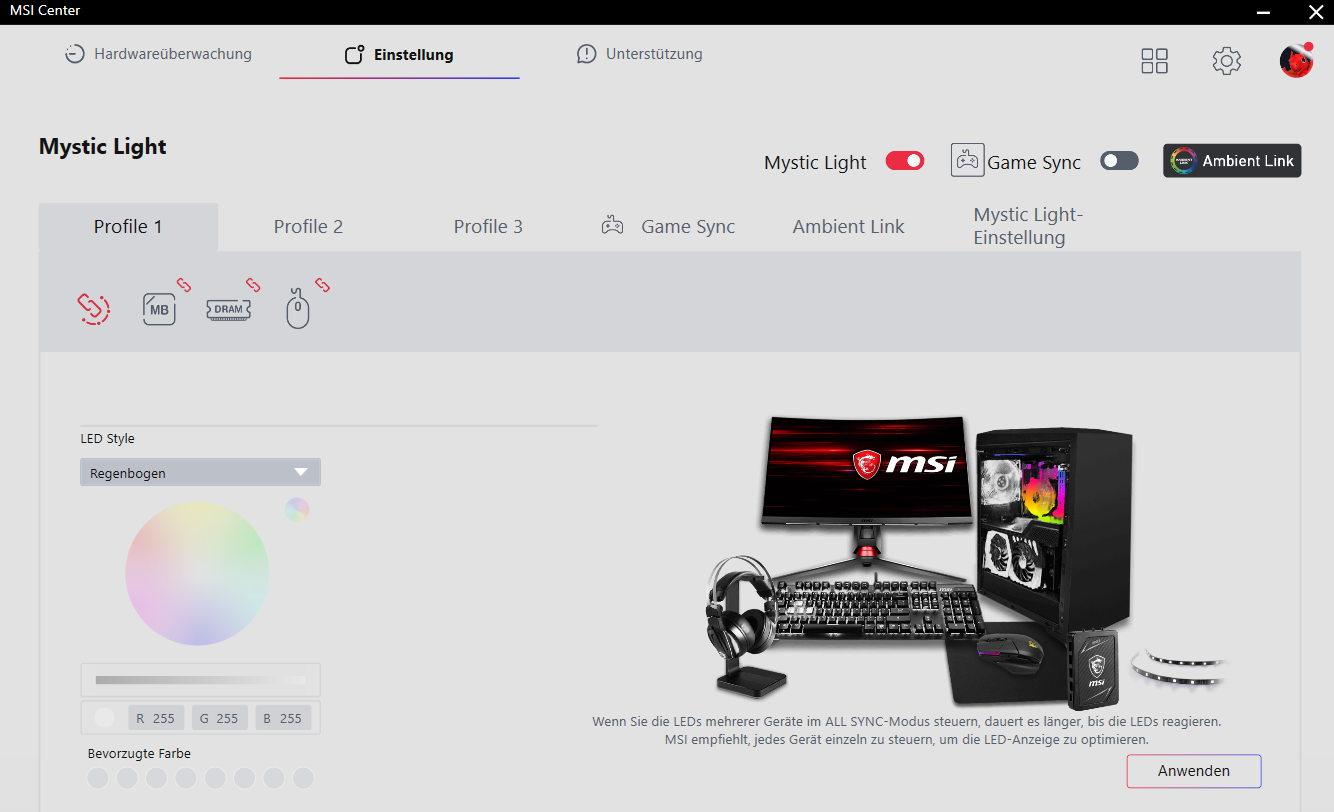 In dem Funktionsset „Mystic Light“ geht es um die Einstellungen bezüglich der Beleuchtung. Verbaute Hardware oder Eingabegeräte, die von MSI erkannt werden, sind oben als einzelne Icons zu sehen. Drei Profile können dabei frei vom Nutzer verwendet werden. Wir nutzen es für die Farbgestaltung des kompletten Rechners samt Maus.