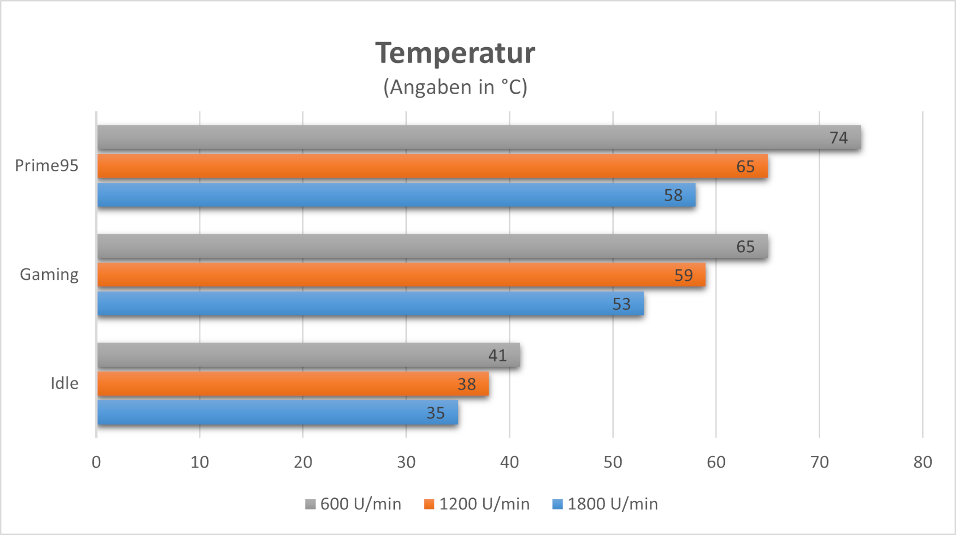 Kommen wir zu den Temperaturen: Diese messen wir in drei verschiedenen Szenarien Idle, Gaming und Prime 95. Jedes Szenario lassen wir 30 Minuten laufen und geben dann die durchschnittliche Temperatur wieder. Zum Testzeitpunkt haben wir eine Raumtemperatur von 21 Grad Celsius. Wir lassen für den Test die vorhandenen Lüfter in drei unterschiedlichen Drehzahlen laufen. Bei den Lüftern sind es 600, 1200 und 1800 U/min und bei der Pumpe setzen wir die Drehzahl auf 3000 U/min. Wie man an den Temperaturen erkennen kann, sind die Temperaturunterschiede vor allem unter Last sehr groß. Aber auch bei der geringsten Geschwindigkeit der Lüfter, befinden sich die Temperaturen noch in einem annehmbaren Bereich. Bei 600 U/min sind die Lüfter kaum wahrzunehmen, erst ab einer Drehzahl von ca. 1000 U/min sind die Lüfter klar zu hören. Was die Lautstärke der Pumpe angeht: Diese ist bis ca. 1700 U/min nicht zu hören, aber selbst bei 3000 U/min ist sie nur leicht zu wahrzunehmen.