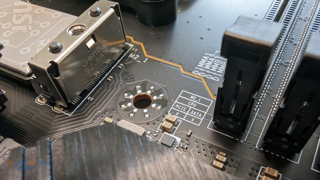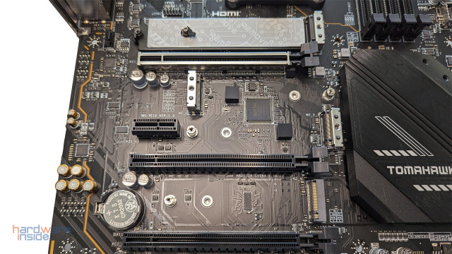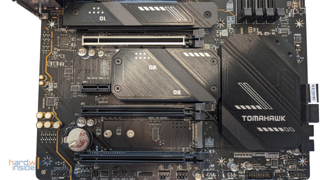 Das MSI MAG X670E TOMAHWAK WIFI verfügt über vier M.2 Steckplätze. Dabei unterstützt der M.2-Port unter dem Kühlkörper, welcher mit 01 gekennzeichnet ist, auch den neuesten PCIe 5.0 Standard über 4 PCIe-Lanes. Die restlichen drei M.2 Slots sind über PCIe 4.0 angebunden. Die Slots 03 und 04 teilen sich einen Kühlkörper, während 04 frei bleibt. Wie bereits erwähnt, teilt sich der vierte Port die Bandbreite mit dem vierten PCIe Steckplatz, falls diese zusammen belegt werden. Die M.2-SSDs werden mit den mitgelieferten MSI EZ M.2-Clips befestigt. Dabei handelt es sich um Schrauben mit einem drehbaren Kunststoffkragen, mit denen die SSD ohne weiteres Werkzeug befestigt werden kann.