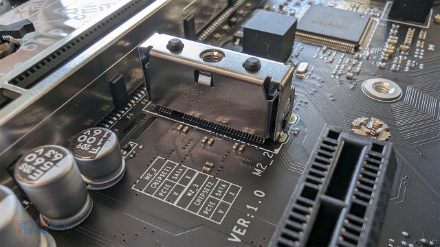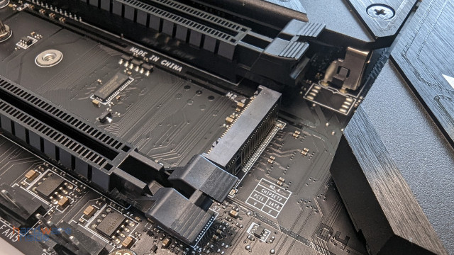 Die insgesamt fünf Kühlkörper aus Aluminium dienen der optimalen Wärmeableitung für den Chipsatz, drei der vier M.2-Steckplätze sowie den MOSFETs und Spulen der VRMs. Unter jedem Kühlkörper befinden sich zudem Wärmeleitpads, die eine saubere Wärmeableitung ermöglichen. Eine kleine Besonderheit ist die Nummerierung der M.2-Slots auf dem jeweiligen Kühlkörper. Da sich der vierte M.2 Slot die Bandbreite mit dem vierten PCIe Slot teilt, besitzt dieser kein Kühlelement.