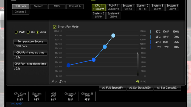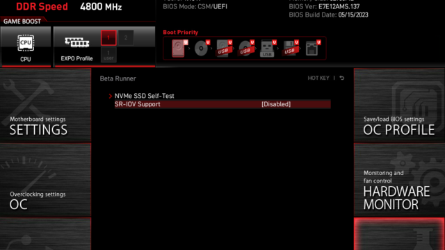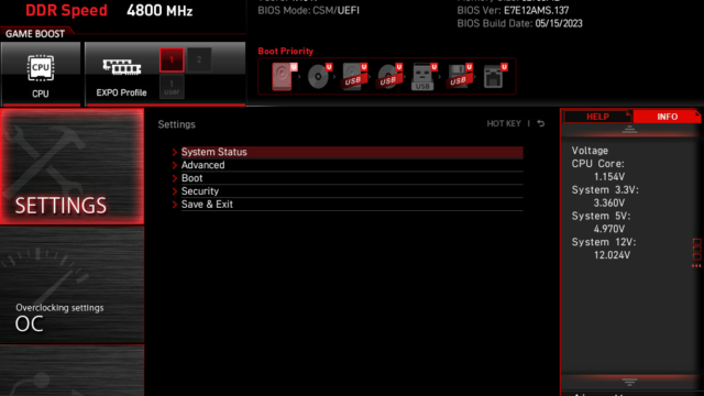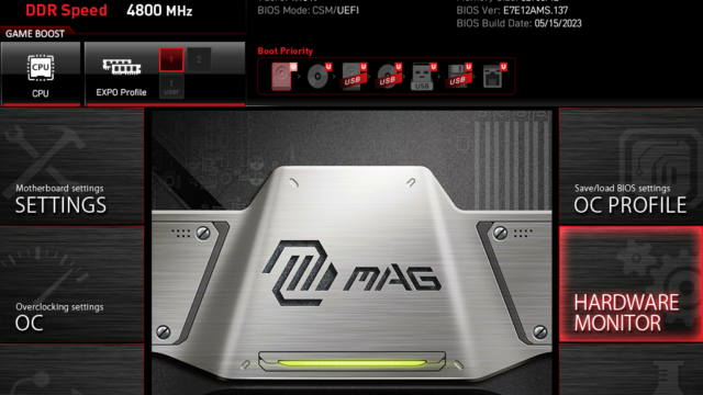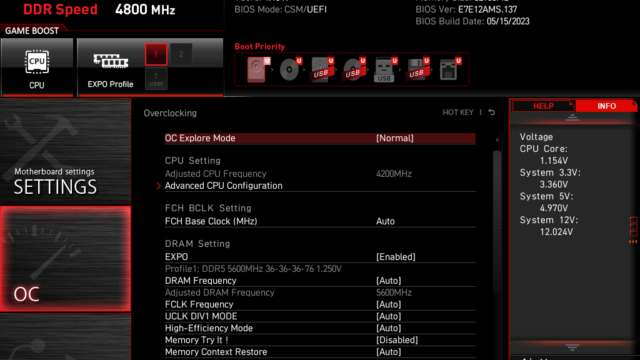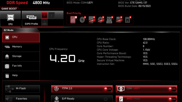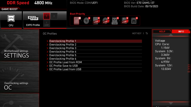 Das UEFI mag auf den ersten Blick überladen wirken, aber alles ist gut sortiert und schnell zu erreichen. Mit der Taste F7 kann man zwischen einem Advanced Mode und einem Easy Mode wechseln, wobei der Easy Mode viele Einstellungen zusammenfasst und nur die wichtigsten anzeigt. Im Advanced-Modus haben wir wiederum die Möglichkeit, auf bestimmte Systemeinstellungen zuzugreifen, wie z. B. die CPU-Ratio oder die Clock-Einstellung. Das EXPO-Profil für den Arbeitsspeicher lässt sich wie die Bootreihenfolge im oberen Bereich in jedem der beiden Modi schnell und einfach ändern. Fast jede Einstellung hat einen Infotext, die meisten sind in Englisch, auch wenn die Sprache auf Deutsch eingestellt sein sollte. Über das X oben rechts kann das BIOS verlassen werden, vorher zeigt das UEFI unsere vorgenommenen Änderungen an und fragt, ob wir mit unseren Änderungen sicher sind. Das BIOS kann entweder über das UEFI im Tab M-Flash oder über den dafür vorgesehenen Button auf dem I/O-Shield des Mainboards aktualisiert werden. Beide Methoden erfordern einen USB-Stick mit der neuen BIOS-Version.