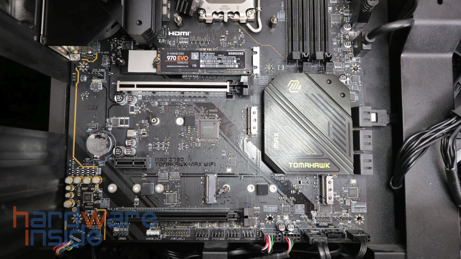 Bevor wir das Mainboard in das Gehäuse setzen, wird die Backplate für unsere AiO-Wasserkühlung an das Mainboard geschraubt. Das Mainboard hat in unserem NZXT H9 Elite genug Platz, sodass alle Anschlüsse bequem von Hand angebracht werden können. Rund um das Mainboard bringen wir die Stecker für die CPU-Energieversorgung, den Pumpenanschluss der AiO, SATA, Front Panel USB und den Rest an. Unsere NVMe M.2 SSD bringen wir an dem ersten Steckplatz an, der werkzeuglos bestückt werden kann. Dabei sind die Schutzfolien der Wärmeleitpaste nicht zu vergessen zu entfernen. Im Anschluss befestigen wir das Mainboard mit den Gehäuseschrauben, bringen Arbeitsspeicher, Kühlkörper und die Grafikkarte an. Da wir rundherum genug Anschlüsse zur Verfügung haben, steht dem Einbau hierbei nichts im Wege.