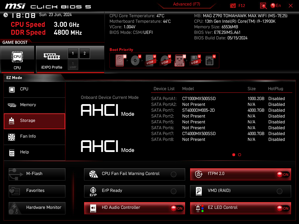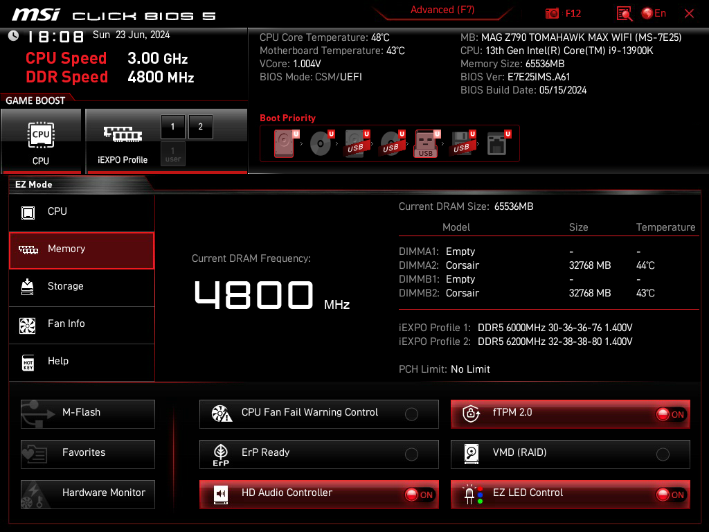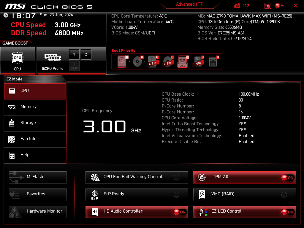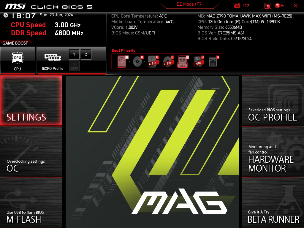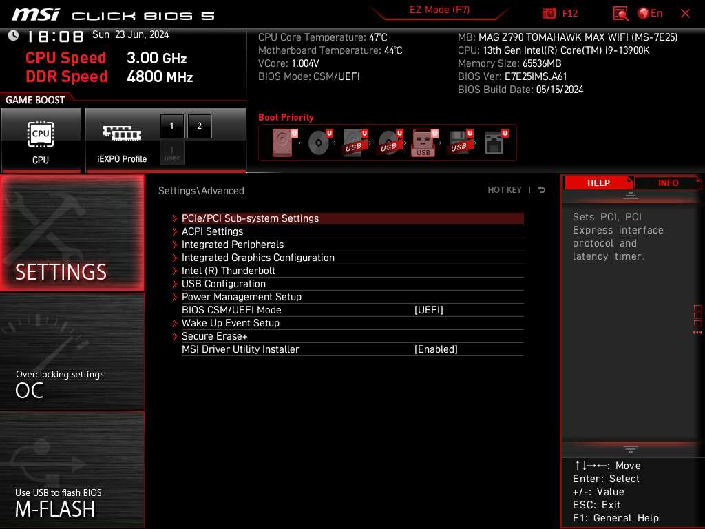 Das UEFI des MSI MAG Z790 Tomahawk Max WIFI ist, wie von MSI gewohnt, anwenderfreundlich gestaltet und erlaubt sämtliche Einstellungen auf intuitive Weise zu bedienen. Beim ersten Start wird man dazu aufgefordert den Typ des CPU-Kühlers zu definieren, der auch nachträglich wieder abgeändert werden kann. Das zeigt dem System Leistungsgrenzen auf und so werden entsprechende Messwerte dargestellt. Weiterhin können wir individuelle Lüfterkurven und eine Bootreihenfolge selbst festlegen. Im erweiterten Modus stehen dem Nutzer eine Vielzahl von weiteren Einstellungen offen. Hierbei können Spannungen und Taktungen von CPU und Arbeitsspeicher vorgenommen werden. Diese Einstellungen sind jedoch für erfahrene Nutzer vorgesehen, um keinen Schaden am System anzurichten.