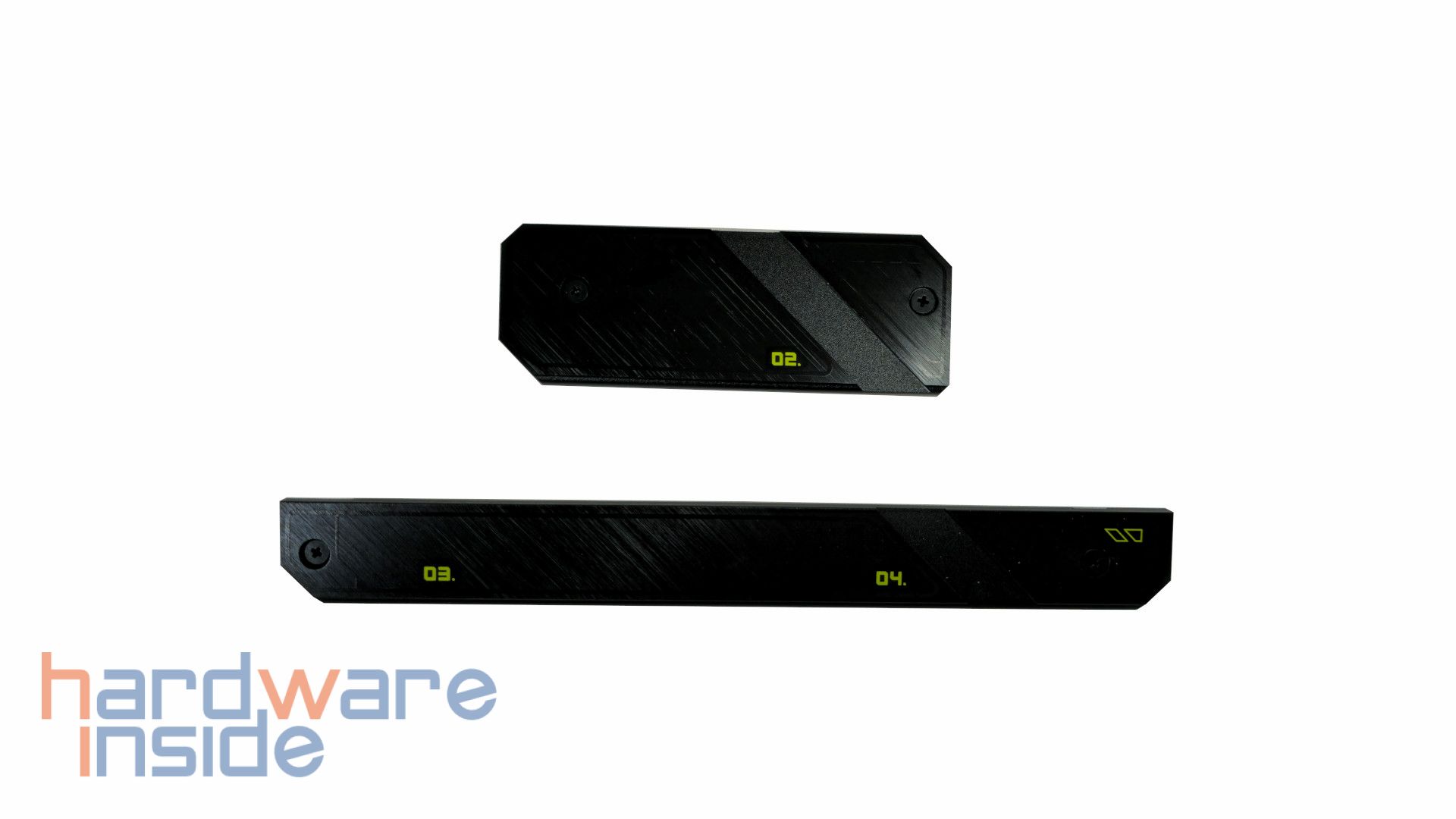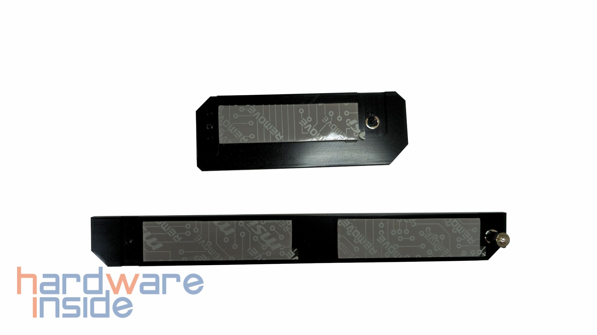 Der erste M.2 Steckplatz wird werkzeuglos demontiert. Hierzu ist nur ein kurzes Reindrücken und Heraushebeln nötig. Auf der Unterseite befindet sich ein Wärmeleitpad, das mit einer Schutzfolie überzogen ist. Je nach Größe der NVMe-SSD kann eine Schraube mit einer Kunststofflasche gewählt werden, die im letzten Schritt an der Vorrichtung am Mainboard einhakt und die SSD in Position hält. Die restlichen M.2 Steckplätze sind ähnlich zum ersten Steckplatz, werden jedoch mit Hilfe von Schrauben am Mainboard gehalten.