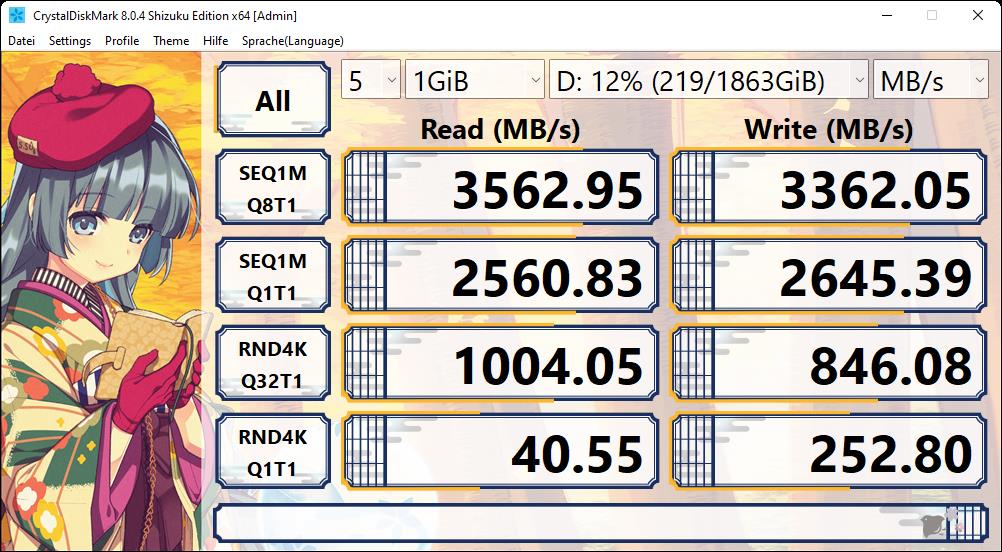Die von uns eingesetzte Samsung 970 Evo Plus M.2 2 Tb erreicht im CrystalDiskMark-Benchmark die beworbenen Datenraten. Mit einer Schreibrate von 3562 MB/s und Leserate von 3362 MB/s erzielen wir sogar eine höhere Leistung als im Datenblatt aufgeführt. Das zeigt uns, dass MSI’s MEG Z690 ACE in der Lage ist, auch die entsprechende Bandbreite zu liefern. Das Mainboard unterstützt vier M.2 SSDs mit einer maximalen Bandbreite von 64 Gbit und damit 8000 MB/s, damit ist unser Ergebnis wenig verwunderlich.