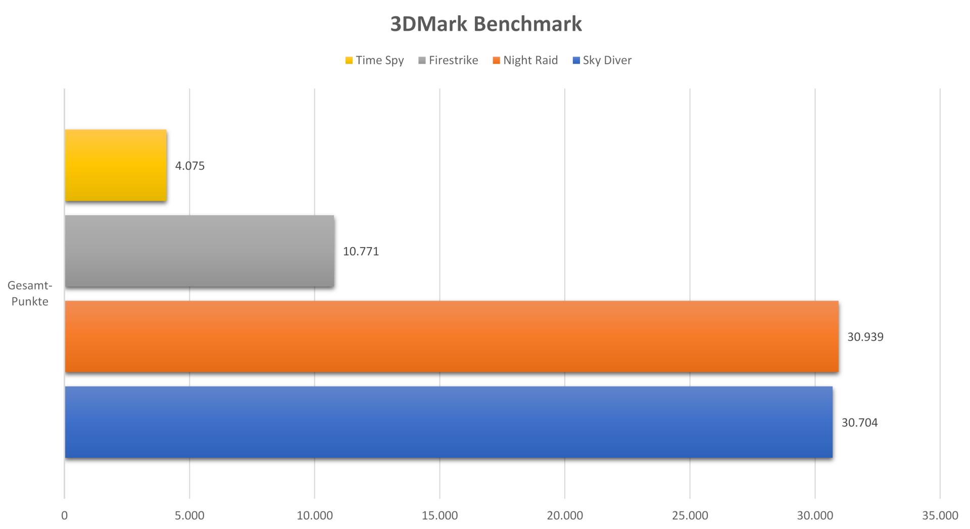 Natürlich lassen wir auch einmal ein paar Benchmarks aus der aktuellen 3DMark Suite über das System herfallen. Da Bilder mehr sagen als tausend Worte, verlinken wir euch die Ergebnisse direkt auf die Namen der Benchmarks: Time Spy, Firestrike, Night Raid und Sky Diver.