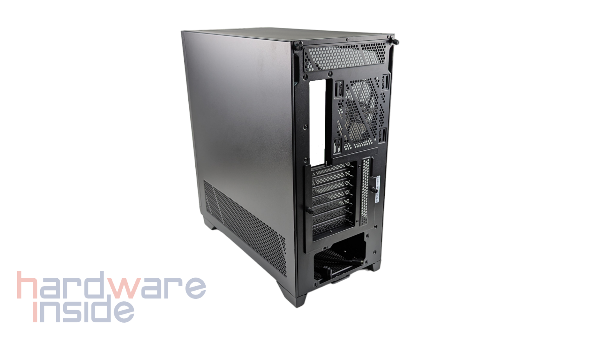 Bei der Rückseite gibt es bei den meisten Gehäusen nicht viel zu erwähnen, das sieht hier etwas anders aus. Denn das Bracket mit den PCI-Slots lässt sich abmontieren und durch das Vertical GPU Bracket ersetzen. Darüber sitzt ein vierter 120 mm ARGB-Lüfter, welcher die warme Luft aus dem Gehäuse befördert. Das rechte Seitenteil besitzt unten Lufteinlässe, um für noch mehr Frischluft im Gehäuse zu sorgen. Zum Schutz vor Staub befindet sich dahinter ein weiterer Staubfilter.