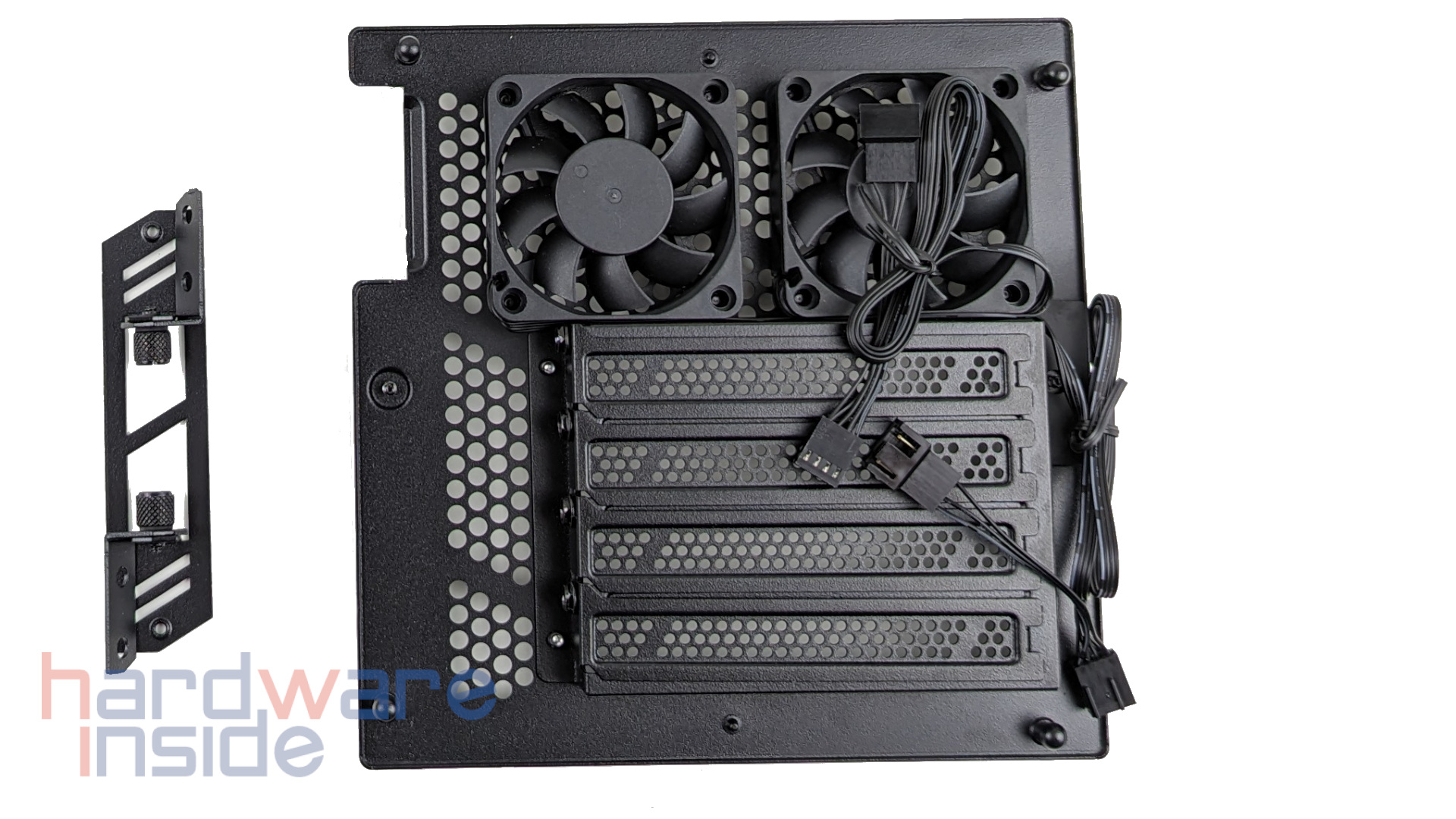 Im Lieferumfang liegen noch zwei Brackets bei. Einmal eins, dass die Möglichkeit bietet, die GPU vertikal einzubauen. Dieses kann noch zusätzlich mit zwei 60 mm ausgestattet werden, sodass auch hinter der GPU für ausreichenden Airflow gesorgt ist. Das zweite Bracket kann an der Kabelblende angebracht werden und unterstützt entweder einen 80 mm oder 120 mm Lüfter, um so ebenfalls für zusätzliche Belüftung zu sorgen. MSI hat uns diese zusätzlich zu dem Sample dazu gelegt, diese gehören normalerweise zum Lieferumfang des MSI MPG GUNGNIR 300P AIRFLOW.