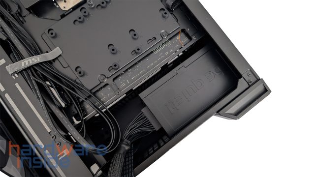 An der Unterseite der Netzteilabdeckung befindet sich außerdem eine kleine Gummierung an der Ecke, in die ein MSI-Logo eingelassen ist. Direkt rechts daneben befindet sich ein weiterer Cage für entweder eine 2.5″ SSD oder eine 3.5″ HDD. Ein kleines Feature des MSI MPG VELOX 300R AIRFLOW PZ ist eine integrierte GPU-Halterung. Diese ist sowohl in der Höhe als auch in der Länge verstellbar.