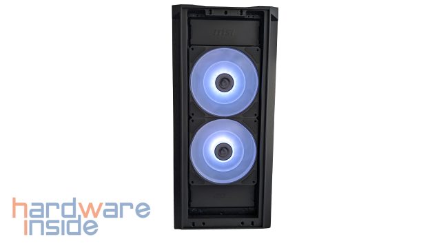 Der Staubfilter ist magnetisch befestigt und kann so leicht gereinigt werden. Dahinter befinden sich die beiden 160 mm ARGB-Lüfter, darüber und darunter zwei Kunststoffabdeckungen, die einmal mit MSI und einmal mit MPG bedruckt sind. Diese lassen sich abnehmen, so dass man vorne entweder drei 120 mm oder drei 140 mm Lüfter einbauen kann.