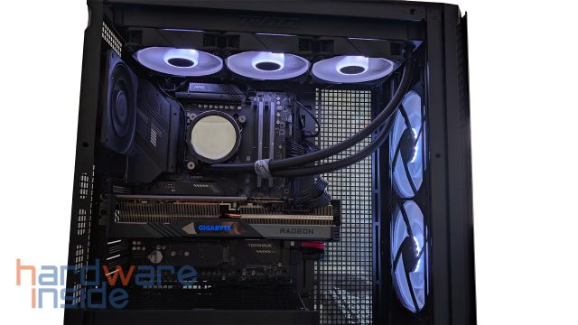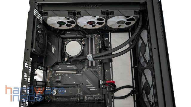 Die Temperaturmessungen wurden bei einer konstanten Raumtemperatur von 20 °C durchgeführt. Dabei kam die All-in-one-Wasserkühlung ASUS ROG Ryuo III 360 ARGB zum Einsatz, die mit dem Stresstest Prime95 (Small FFTs) für die CPU, dem Spiel Black Myth Wukong im Gaming-Szenario sowie im Idle-Betrieb bei leichtem Webverkehr getestet wurde. Jeder Testlauf dauerte mindestens 30 Minuten, um kurzfristige Temperaturschwankungen zu minimieren. Die Pumpe war während aller Tests konstant auf 2045 U/min eingestellt, was etwa 75 % der maximalen Leistung entspricht. Diese Konfiguration bietet eine gute Balance zwischen Kühlleistung und Lautstärke, da die Pumpe nahezu unhörbar bleibt und dennoch eine ordentliche Leistung liefert. Durch die AiO Wasserkühlung sind drei zuästzliche 120 mm in das Gehäuse gewandert, die an dem Radiator befestigt sind. Damit haben wir nun also zwei 160 mm Lüfter in der Front und insgesamt vier 120 mm Lüfter, die die Luft wieder nach draußen pusten.