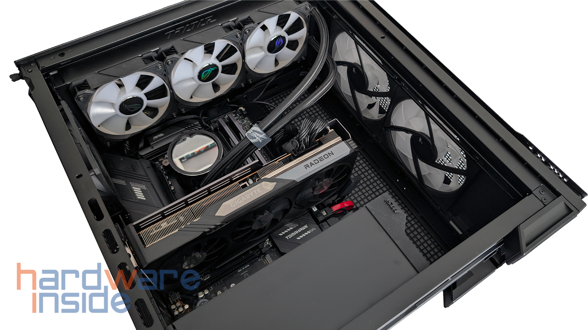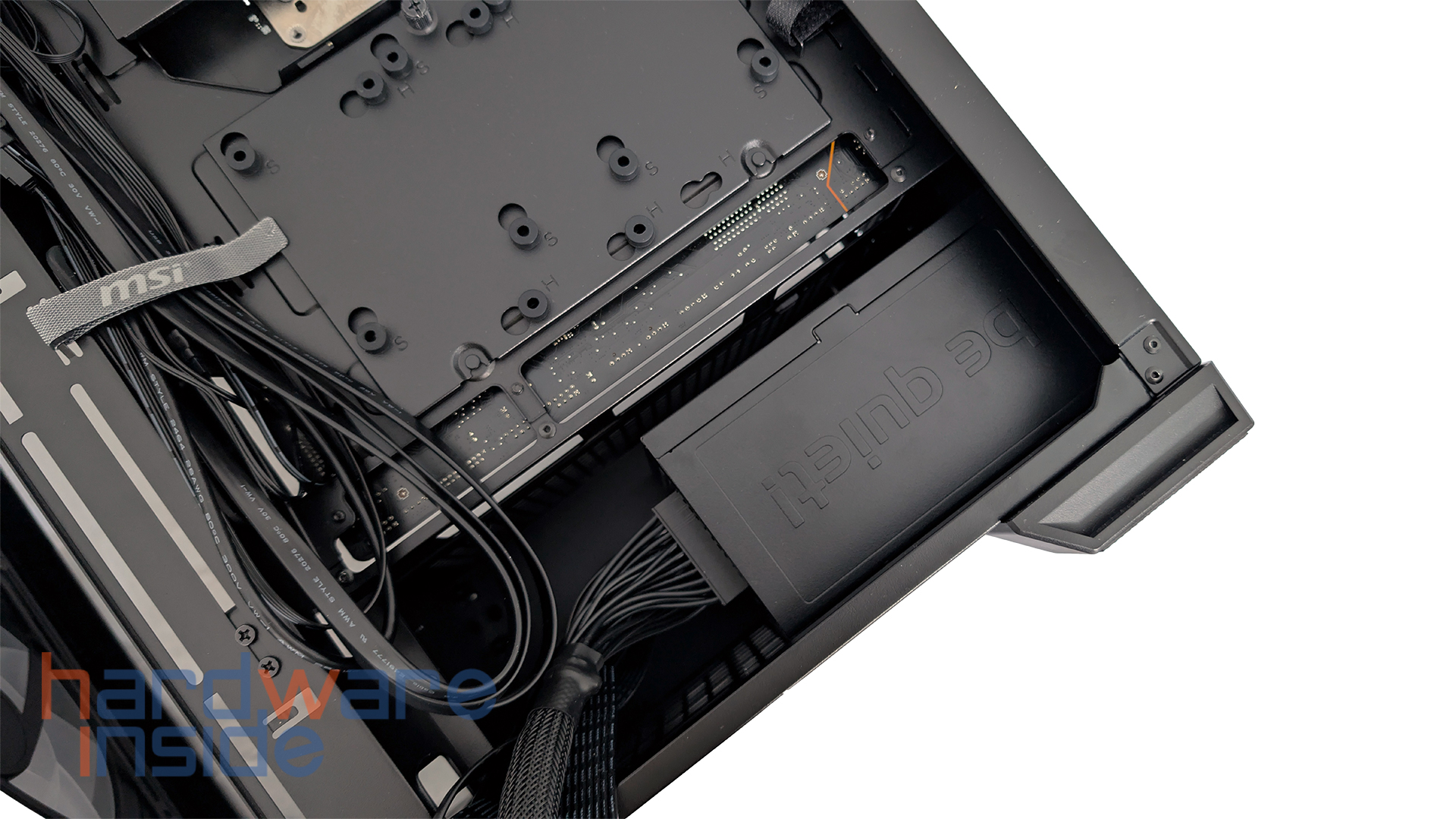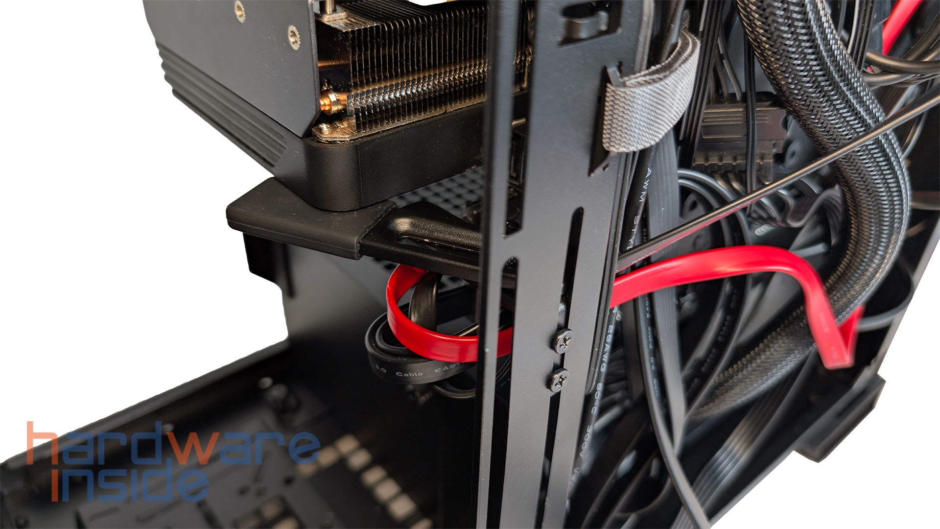 Durch die Abdeckung im unteren Bereich können die meisten Kabel verdeckt verlegt werden. Auf der Oberseite des Deckels befinden sich Lüftungsöffnungen, die zusätzlich die Montage von zwei weiteren 120 mm Lüftern ermöglichen. Auf der linken Seite befinden sich die sieben Steckplätze für Erweiterungskarten, der 120 mm Lüfter und die Öffnung für die Anschlüsse des Mainboards. Das Mainboardtray enthält Gewinde für alle gängigen Mainboard-Formate. Von Mini ITX bis E-ATX kann praktisch jedes Mainboard eingebaut werden.