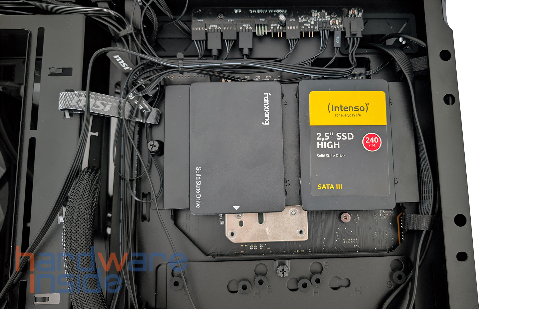 Insgesamt können auf der Rückseite vier 2,5″ SSDs eingebaut werden. Jeweils zwei können auf einer Platte montiert werden. Um den Einbau zu erleichtern, können die Platten entfernt werden. Dazu ist allerdings ein Werkzeug nötig, um jeweils eine Schraube zu lösen. An der unteren Platte sind zusätzlich Antivibrationsgummis angebracht, um auch einer 3.5″ HDD Halt zu geben.