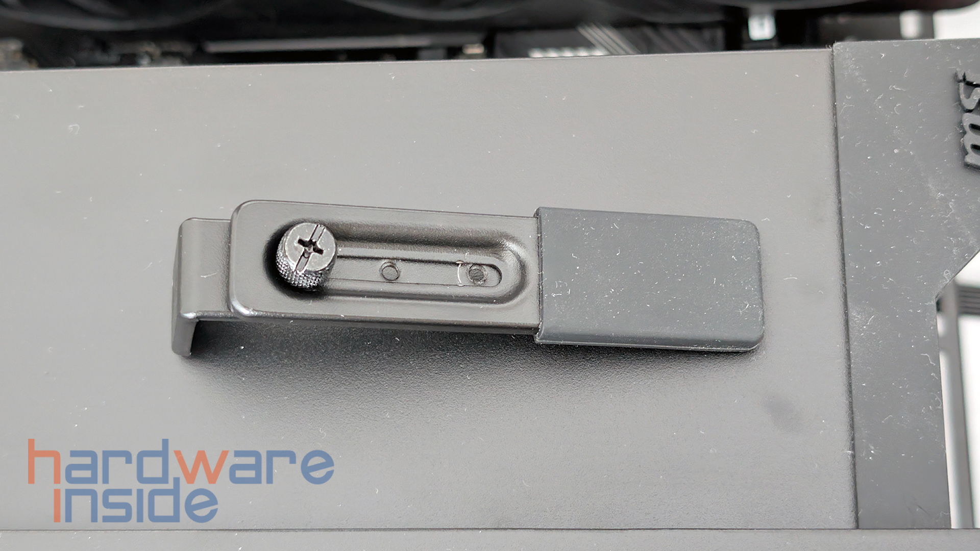 An der Unterseite der Netzteilabdeckung befindet sich außerdem eine kleine Gummierung an der Ecke, in die ein MSI-Logo eingelassen ist. Direkt rechts daneben befindet sich ein weiterer Cage für entweder eine 2.5″ SSD oder eine 3.5″ HDD. Ein kleines Feature des MSI MPG VELOX 300R AIRFLOW PZ ist eine integrierte GPU-Halterung. Diese ist sowohl in der Höhe als auch in der Länge verstellbar.