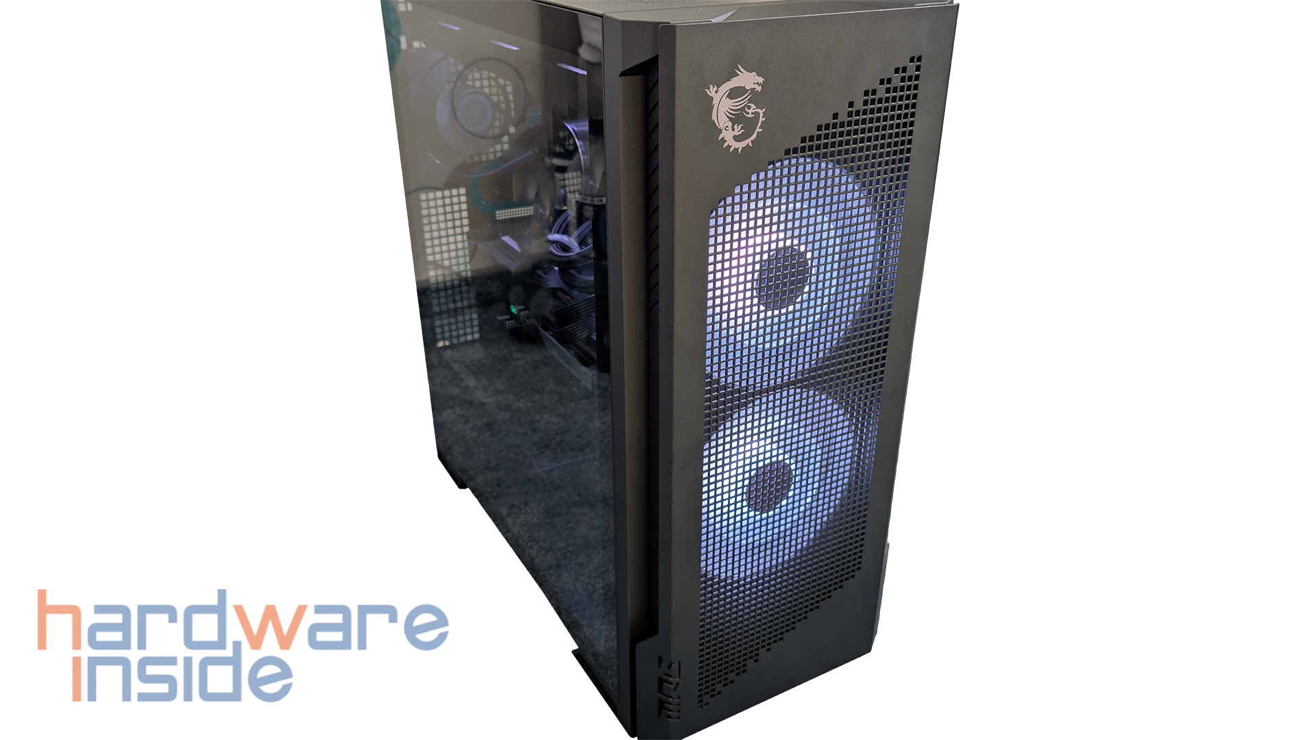 Die Front des MSI MPG VELOX 300R AIRFLOW PZ zeichnet sich vor allem durch eine große perforierte Fläche aus, durch die die beiden großen 160 mm Lüfter ausreichend Luft ins Gehäuseinnere transportieren können. Die Ecken sind abgeflacht, was für ein recht modernes Design sorgt. Oben links ist das MSI-Logo zu sehen.