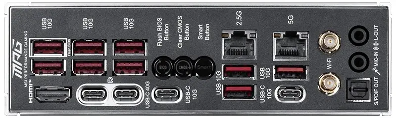 Das Rear-I/O bietet unter anderem USB-C mit bis zu 40 Gbit/s, weitere schnelle USB-Ports, HDMI 2.1, Dual-LAN und optischen Audio-Ausgang.