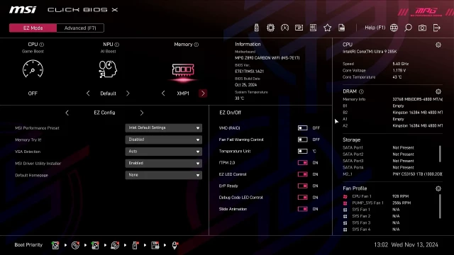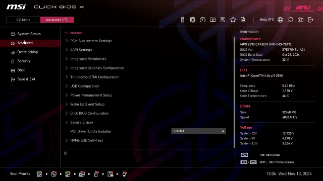 Softwareseitig hat sich nicht viel getan, das MSI Center mit seinen Stärken und Schwächen kommt weiterhin zum Einsatz. Im BIOS hat der Hersteller der neuen Mainboardgeneration jedoch ein schickes Makeover verpasst, das einen modernen und intuitiven Look bietet.