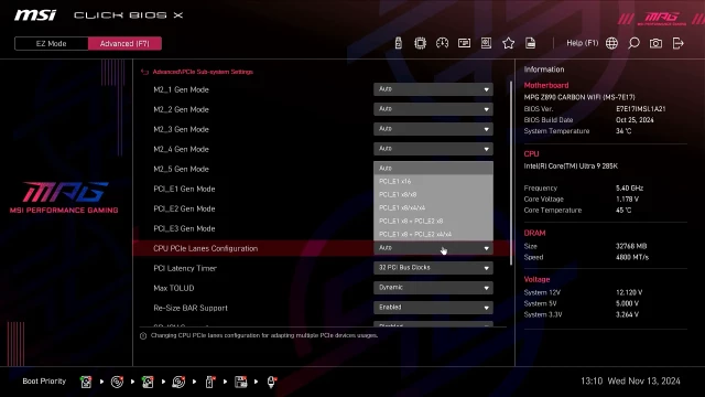 Die verfügbaren PCIe Steckplätze des MSI MPG Z890 CARBON WIFI bieten sehr interessante Features, die das Mainboard in einigen Szenarien zu etwas Besonderem machen. Insgesamt befinden sich drei PCIe Steckplätze in voller Länge auf dem Mainboard, wobei der Hersteller die beiden oberen als „Lightning Gen 5 PCI-E“ Steckplätze bezeichnet. Sie bieten eine besonders störungsresistente Verarbeitung und sind mit Metall verstärkt, um die Belastbarkeit zu erhöhen. Das Besondere an den beiden Steckplätzen ist jedoch ihre Anbindung und die Möglichkeit, diese zu nutzen. Beide Slots sind direkt mit den PCIe 5.0 Datenleitungen der CPU verbunden, was eine besonders hohe Performance und geringe Latenzzeiten garantiert. Die CPUs des Sockels 1851 verfügen jedoch nur über 20 PCIe 5.0 Datenleitungen. Diese können auf dem MSI MPG Z890 CARBON WIFI sehr flexibel genutzt werden. Generell unterstützt nur der obere Slot eine x16 Datenanbindung, werden diese genutzt, ist der zweite Slot gar nicht angebunden und somit funktionslos. Die Datenverbindungen können aber z.B. so eingestellt werden, dass beide Slots eine x8 Verbindung zulassen. Dies könnte sich bei den kommenden Grafikkartengenerationen als echter Game-Changer herausstellen, wenn diese uneingeschränkt über eine PCIe 5.0 x8 Schnittstelle angebunden werden können. Das MSI Z890 Carbon erlaubt dann den gleichzeitigen Betrieb von zwei solchen Grafikkarten.
