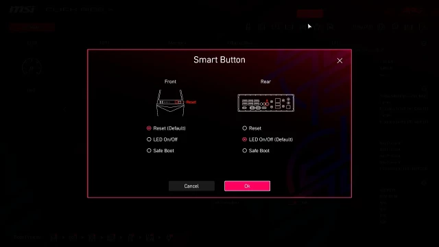Neben allen Anschlüssen befinden sich auf der Rückseite auch drei Taster. Die Funktion des Clear-CMOS Buttons sollte selbst erklärend sein. Auch der Flash Bios Button ist einfach zu erklären, mit ihm kann das BIOS über einen USB-Stick geflasht werden. Die Funktion des Smart Buttons kann im BIOS eingestellt werden, zur Auswahl stehen hier die Reset-Funktion, eine Steuerung der LED-Elemente (an oder aus) oder eine Safe Boot Option.