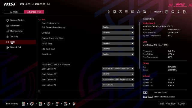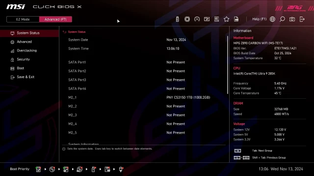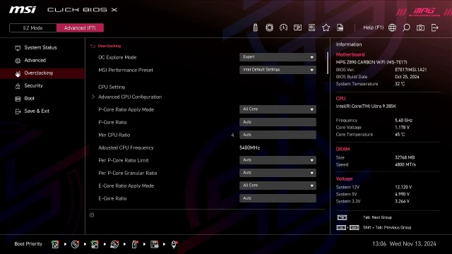 Für die neue Mainboard-Generation hat MSI das Design des UEFI-BIOS grundlegend überarbeitet. Wie gewohnt startet das UEFI-BIOS in einer einfachen Ansicht, in der Einstellungen wie das aktive Speicherprofil oder das Performance-Preset definiert werden können. Es werden grundlegende Informationen über das System angezeigt und einige leicht verständliche Optionen angeboten. In einem Hardware-Monitor können Lüfterkurven für alle Lüfter und Pumpen definiert und die Funktion des Smart-Buttons festgelegt werden. Dieser kann als Reset-Taster, für eine Safe-Boot-Option oder zum Ein-/Ausschalten der LED-Beleuchtung eingestellt werden. Leider kann der Smart-Button nicht als allgemeiner Start-Button definiert werden. Die gleichen Optionen stehen auch für den Reset-Taster der Frontplatte zur Verfügung. In der erweiterten Version des BIOS finden wir wie gewohnt umfangreiche Optionen zum Übertakten der CPU und des Arbeitsspeichers. Auch für die PCIe Bifurcation bzw. Verteilung der PCIe Lanes können hier viele verschiedene Optionen gewählt werden. Der erweiterte Bereich des BIOS ist wie immer sehr umfangreich, eine Auflistung aller Features würde hier den Rahmen sprengen. Allen Enthusiasten, die sich für die weiteren Optionen interessieren, können wir die Z890 BIOS Dokumentation des Herstellers empfehlen, diese findet ihr als PDF verlinkt.