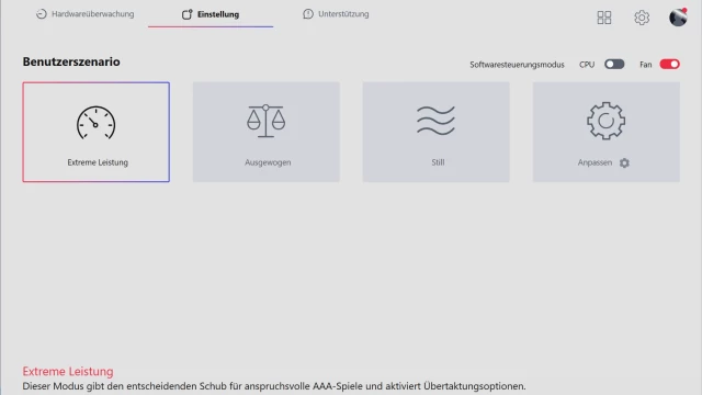 Als primäre Begleitsoftware kann das bekannte MSI-Center eingesetzt werden. Die Software ist modular aufgebaut und kann nach den Wünschen des Anwenders angepasst werden. In der Grundausstattung ist die Installation bzw. das Update von Treibern oder des BIOS darüber sehr einfach möglich. Die optionalen Funktionen umfassen z.B. RGB-Beleuchtungssteuerung, Lüftersteuerung oder Übertaktung der CPU. Die Benutzeroberfläche ist sehr einfach gestaltet und ermöglicht eine intuitive Bedienung. Etwas störend am MSI Center ist die lange Ladezeit des Programms, auch sind nicht alle Texte und Schaltflächen ins Deutsche übersetzt. Vor allem, da die Software nun schon einige Jahre verfügbar ist, finden wir es schade, dass viele Texte und Meldungen noch nicht ins Deutsche übersetzt wurden. Bei beiden Programmen muss man bei der Installation der Treiber etwas aufpassen, sonst werden einige unnötige Programme direkt mitinstalliert.