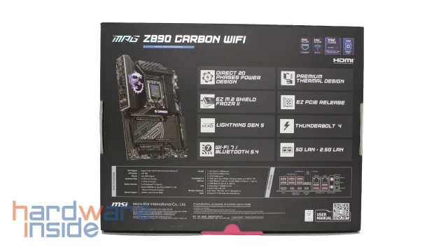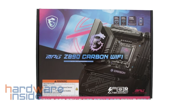 Die Verpackung des MSI MPG Z890 Carbon ist im Vergleich zu anderen Mainboards der Carbon-Serie auffällig bunt und verspielt gestaltet, was uns sehr positiv aufgefallen ist. Farblich heben sich pinke und blaue Neontöne von dem ansonsten schwarzen Karton ab. Die Vorderseite der Verpackung zeigt das Mainboard und weist mit Icons auf einige der wichtigsten Features hin. Dazu gehören 5Gbit/s Ethernet, Wi-Fi 7 und natürlich der Z890 Chipsatz. Auf der Rückseite werden die technischen Daten noch einmal im Detail aufgelistet, auch eine schematische Darstellung der verfügbaren Anschlüsse auf der Rückseite ist hier zu finden.