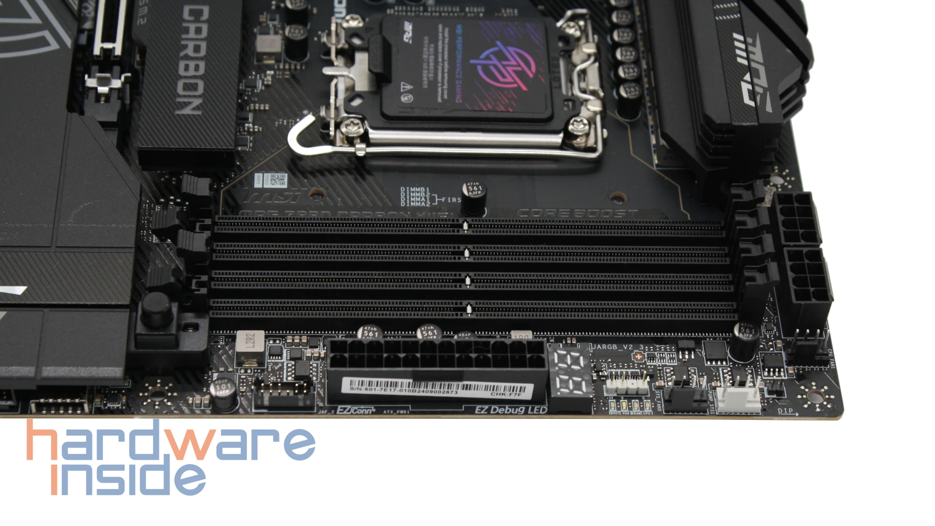 Mit dem MSI MPG Z890 CARBON WIFI haben wir die Möglichkeit bis zu vier Arbeitsspeicherriegel einzubauen, diese sind in zwei Kanäle aufgeteilt. Die maximale Arbeitsgeschwindigkeit des Arbeitsspeichers ist abhängig von der Anzahl der Riegel pro Kanal und den Eigenschaften der verwendeten Riegel. Der Hersteller gibt eine maximale Geschwindigkeit von DDR5-9200 in einer 1DPC 1R-Konfiguration (ein Riegel pro Kanal, Single Rank) an. Außerdem unterstützt das Mainboard den neuen Standard „CUDIMM“, die Abkürzung CU steht für Clocked Unbuffered, Arbeitsspeicher mit dieser Bezeichnung besitzen einen eigenen Takt auf dem Riegel, wodurch hohe Geschwindigkeiten besonders stabil gehalten werden können.