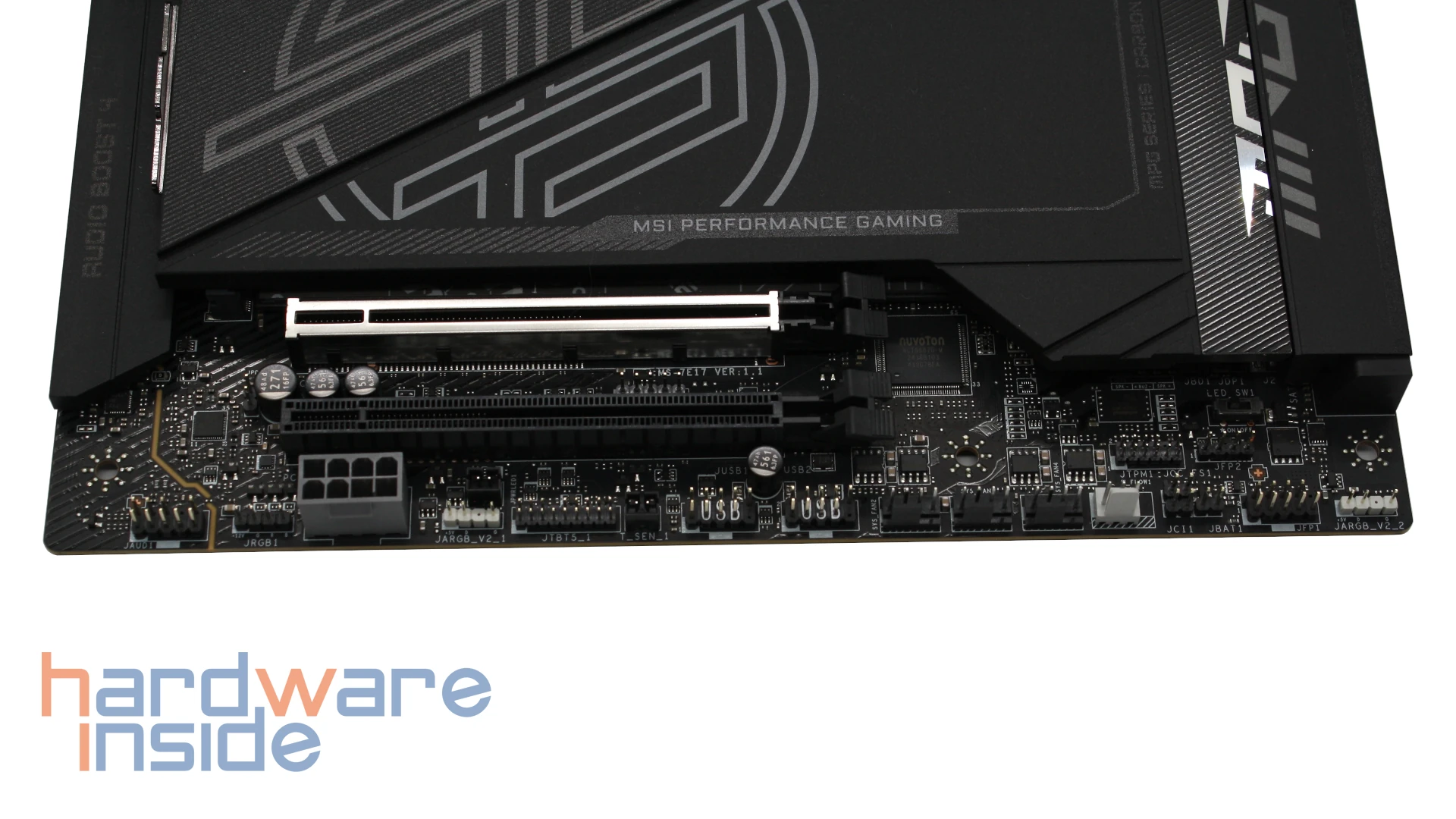 Die verfügbaren PCIe Steckplätze des MSI MPG Z890 CARBON WIFI bieten sehr interessante Features, die das Mainboard in einigen Szenarien zu etwas Besonderem machen. Insgesamt befinden sich drei PCIe Steckplätze in voller Länge auf dem Mainboard, wobei der Hersteller die beiden oberen als „Lightning Gen 5 PCI-E“ Steckplätze bezeichnet. Sie bieten eine besonders störungsresistente Verarbeitung und sind mit Metall verstärkt, um die Belastbarkeit zu erhöhen. Das Besondere an den beiden Steckplätzen ist jedoch ihre Anbindung und die Möglichkeit, diese zu nutzen. Beide Slots sind direkt mit den PCIe 5.0 Datenleitungen der CPU verbunden, was eine besonders hohe Performance und geringe Latenzzeiten garantiert. Die CPUs des Sockels 1851 verfügen jedoch nur über 20 PCIe 5.0 Datenleitungen. Diese können auf dem MSI MPG Z890 CARBON WIFI sehr flexibel genutzt werden. Generell unterstützt nur der obere Slot eine x16 Datenanbindung, werden diese genutzt, ist der zweite Slot gar nicht angebunden und somit funktionslos. Die Datenverbindungen können aber z.B. so eingestellt werden, dass beide Slots eine x8 Verbindung zulassen. Dies könnte sich bei den kommenden Grafikkartengenerationen als echter Game-Changer herausstellen, wenn diese uneingeschränkt über eine PCIe 5.0 x8 Schnittstelle angebunden werden können. Das MSI Z890 Carbon erlaubt dann den gleichzeitigen Betrieb von zwei solchen Grafikkarten.