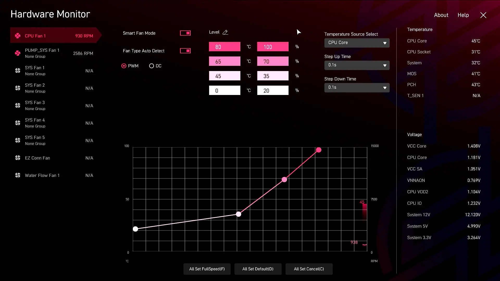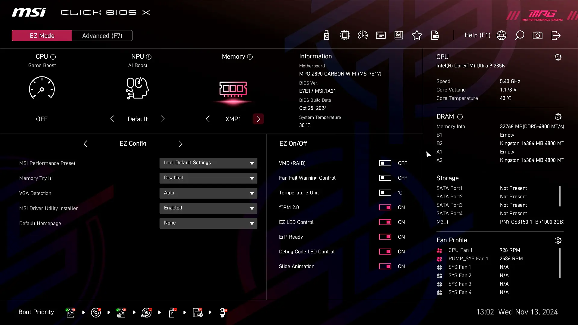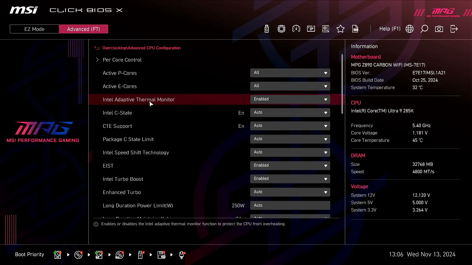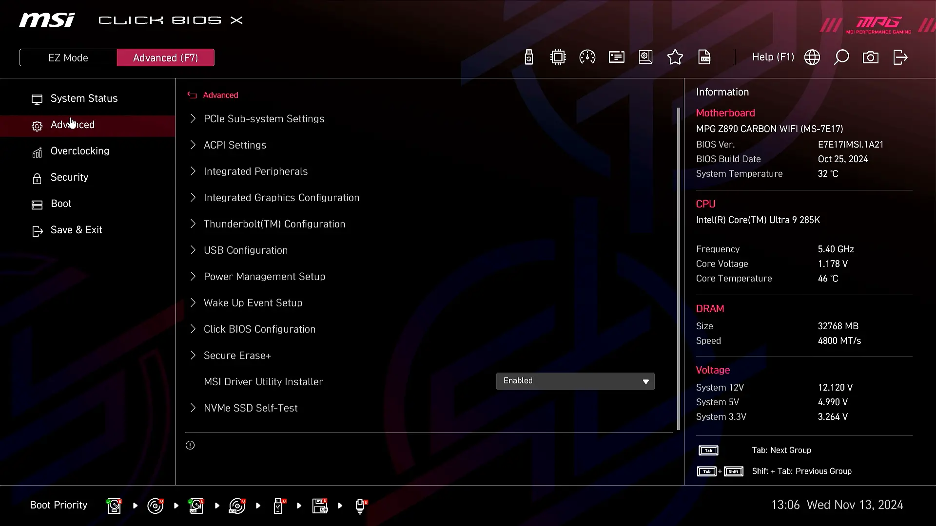 Für die neue Mainboard-Generation hat MSI das Design des UEFI-BIOS grundlegend überarbeitet. Wie gewohnt startet das UEFI-BIOS in einer einfachen Ansicht, in der Einstellungen wie das aktive Speicherprofil oder das Performance-Preset definiert werden können. Es werden grundlegende Informationen über das System angezeigt und einige leicht verständliche Optionen angeboten. In einem Hardware-Monitor können Lüfterkurven für alle Lüfter und Pumpen definiert und die Funktion des Smart-Buttons festgelegt werden. Dieser kann als Reset-Taster, für eine Safe-Boot-Option oder zum Ein-/Ausschalten der LED-Beleuchtung eingestellt werden. Leider kann der Smart-Button nicht als allgemeiner Start-Button definiert werden. Die gleichen Optionen stehen auch für den Reset-Taster der Frontplatte zur Verfügung. In der erweiterten Version des BIOS finden wir wie gewohnt umfangreiche Optionen zum Übertakten der CPU und des Arbeitsspeichers. Auch für die PCIe Bifurcation bzw. Verteilung der PCIe Lanes können hier viele verschiedene Optionen gewählt werden. Der erweiterte Bereich des BIOS ist wie immer sehr umfangreich, eine Auflistung aller Features würde hier den Rahmen sprengen. Allen Enthusiasten, die sich für die weiteren Optionen interessieren, können wir die Z890 BIOS Dokumentation des Herstellers empfehlen, diese findet ihr als PDF verlinkt.
