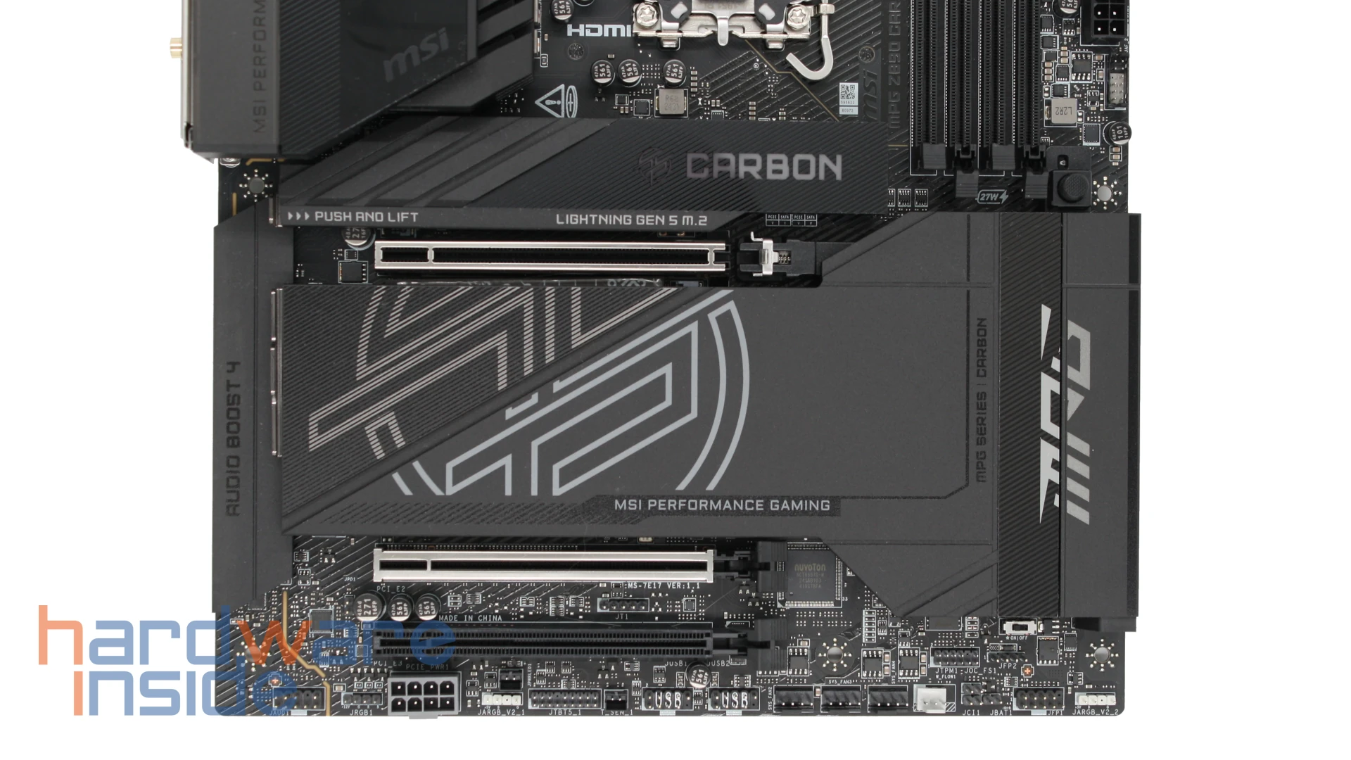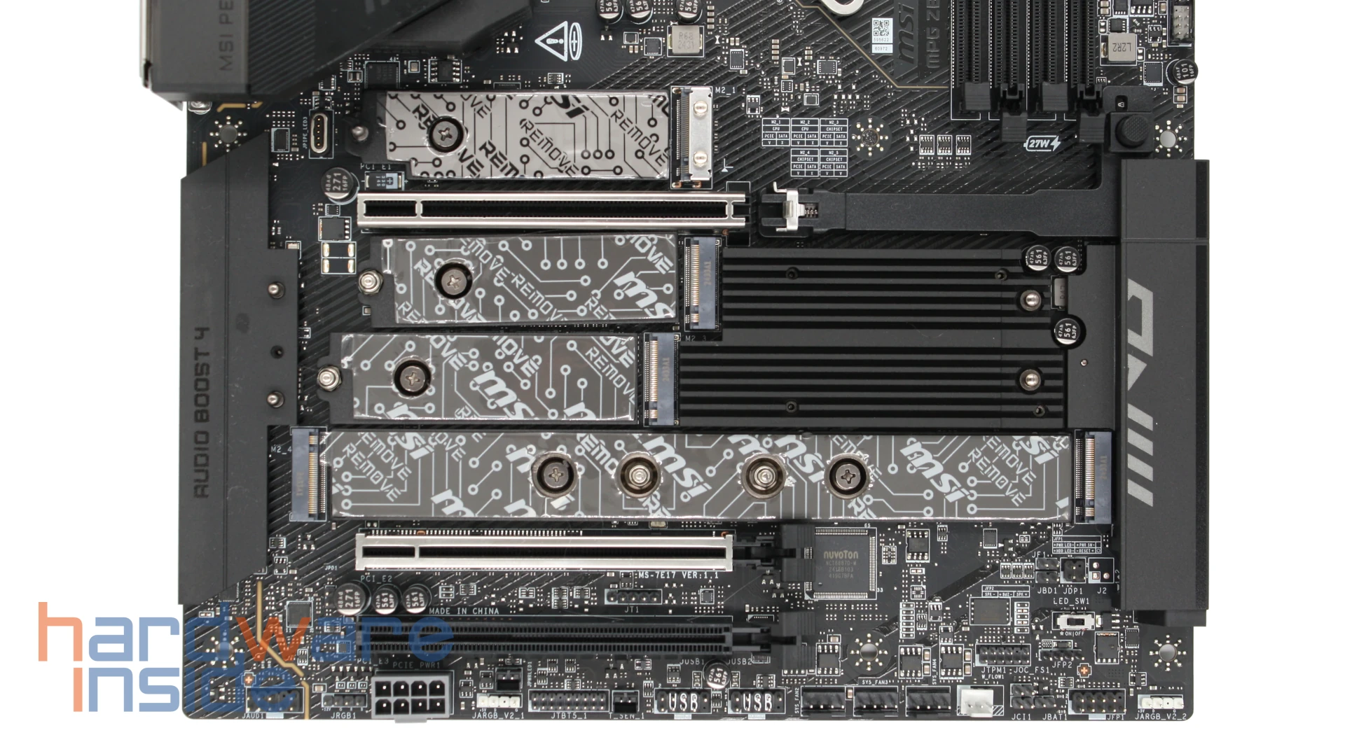 Die Kühlkörper aller M.2 SSDs sind mit Halterungen ausgestattet, die ohne Werkzeug entfernt und wieder angebracht werden können. Dazu muss jeweils nur ein Riegel betätigt werden und der Kühlkörper kann sehr einfach entfernt werden. Die Steckplätze der SSDs selbst sind mit ähnlichen Merkmalen ausgestattet, so dass auch die SSDs ohne weiteres Werkzeug leicht eingebaut werden können. Zusätzlich sind beide PCIe 5.0 Slots mit Metall verstärkt, der primäre Slot verfügt zudem über einen versetzten und leicht zugänglichen Verriegelungsmechanismus. So kann eine eingebaute GPU leicht entriegelt werden, ohne dass ein Mechanismus direkt am Slot betätigt werden muss.