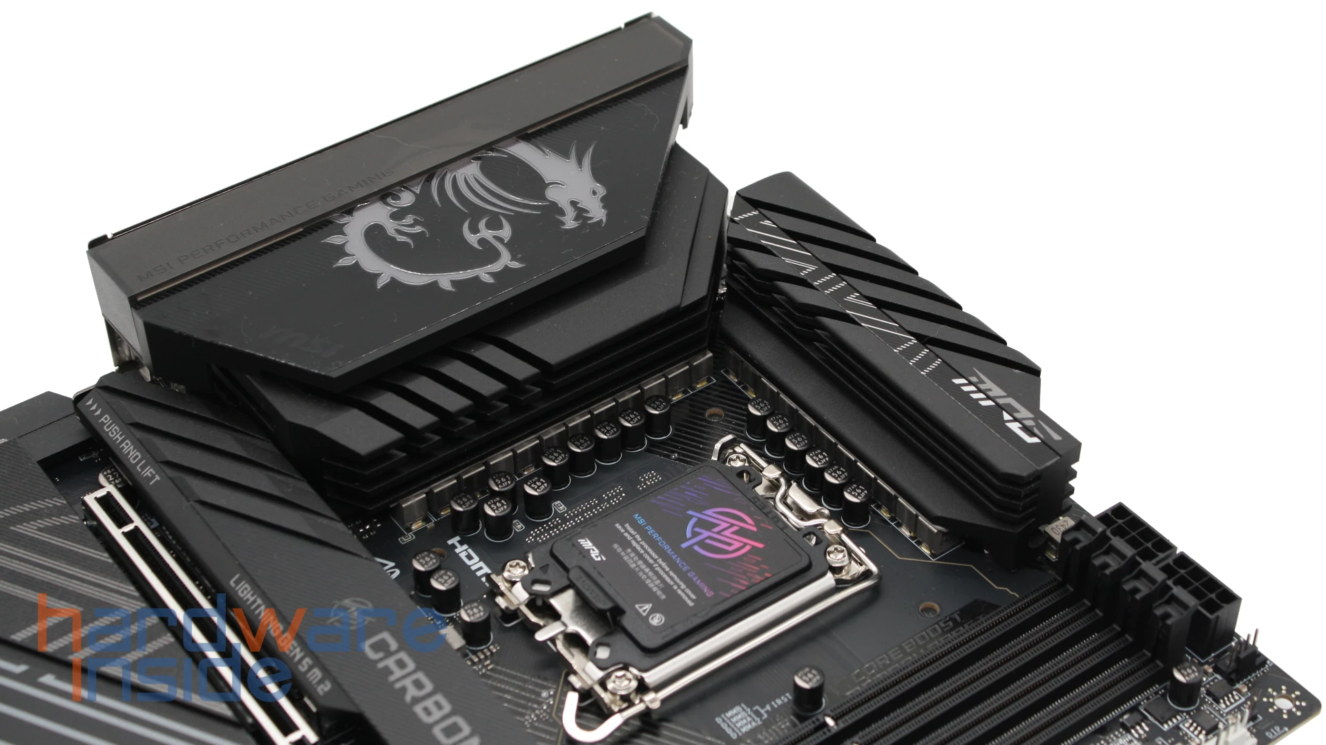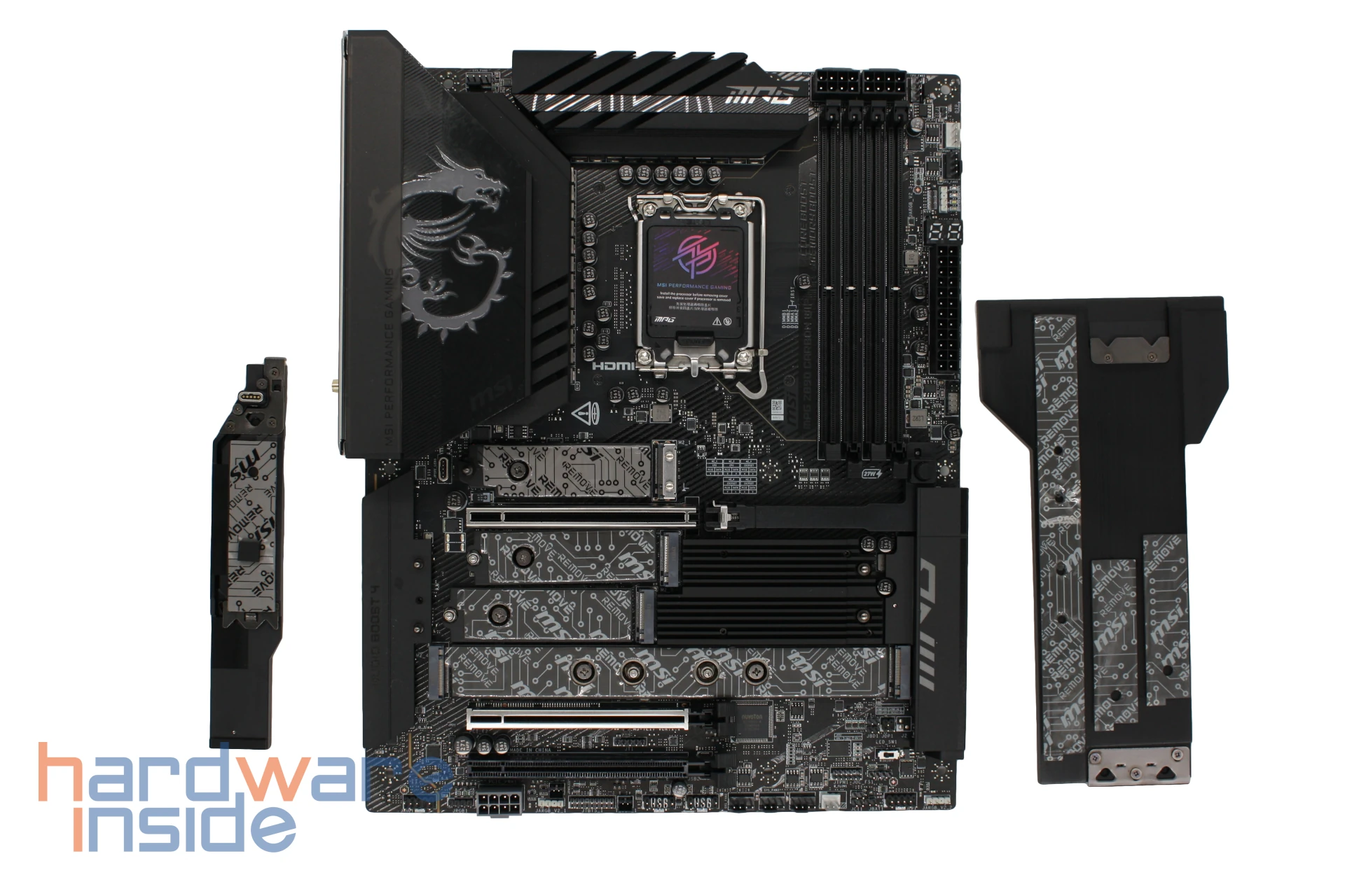 Da die Endstufen eine hohe Leistung erbringen können, benötigen sie eine effektive Kühllösung. Diese wurde vom Hersteller durch zwei massive Kühlkörper realisiert, die über eine Heatpipe miteinander und über Wärmeleitpads mit den Endstufen verbunden sind. Auf der linken Seite bildet eine Blende den optischen Abschluss zwischen den Kühlkörpern und dem fest montierten IO-Shield, auf dem ein MSI-Drachen integriert ist, der durch RGB-LEDs beleuchtet wird.