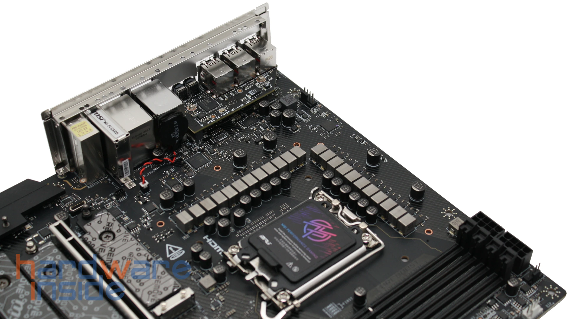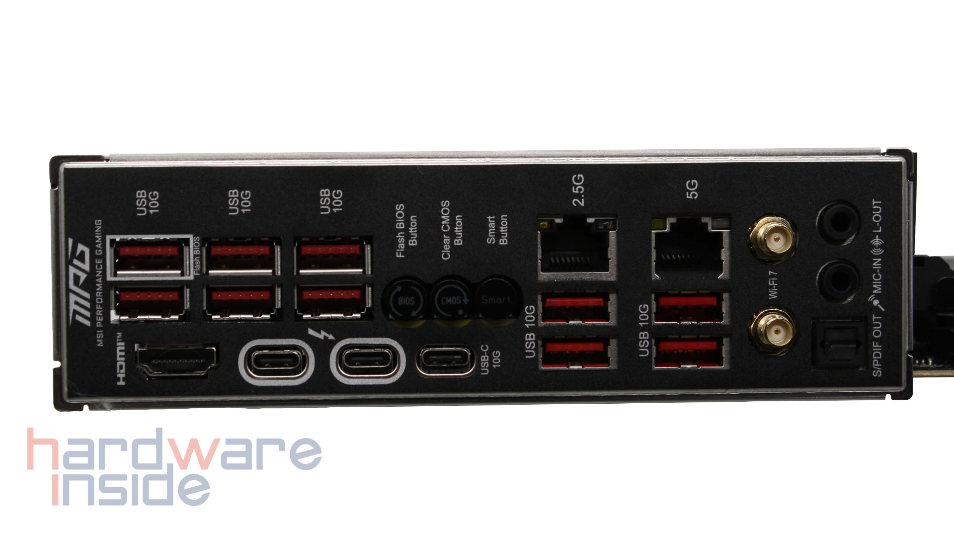 Als Grafikschnittstelle steht neben den Thunderbolt-Ports ein HDMI-Anschluss zur Verfügung, dieser unterstützt HDMI 2.1. Alle diese Grafikschnittstellen funktionieren nur in Verbindung mit CPUs, die über eine Grafikeinheit verfügen. Für schnelle Netzwerkverbindungen stehen auf dem Mainboard drei Optionen zur Verfügung: Kabelgebunden stehen ein 2,5 Gbit/s und ein 5 Gbit/s LAN-Anschluss zur Verfügung, aber auch drahtlos kann das Board schnelle Netzwerkverbindungen bieten, so bietet die Rückblende hier Antennenanschlüsse für drahtlose Verbindungen nach dem Wi-Fi 7 Standard.