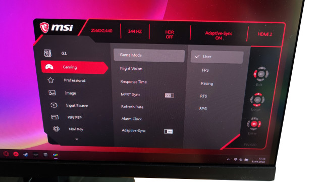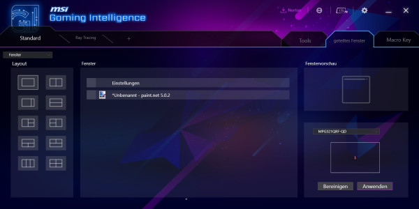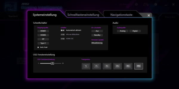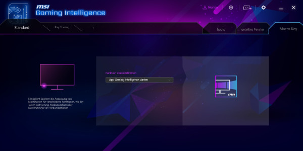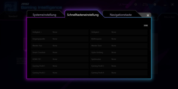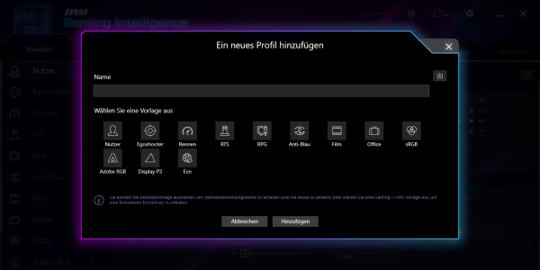 Die App, von der wir gerade berichteten, nennt sich „MSI Remote Display“. Sie ist in drei Bereiche aufgeteilt, im Bereich Standard können wir die Einstellungen des Monitors vornehmen, wie wir es auch in der MSI Gaming Intelligence und dem OSD können. Auch die vorgefertigten Profile finden wir hier wieder. Weiter lassen sich noch fünf eigene Profile anlegen. Die App geht noch ein bisschen weiter, denn hier ist es auch möglich, die Beleuchtung auf der Rückseite des Monitors einzuschalten und einen entsprechenden Modus auszuwählen. Insgesamt stehen 11 Modi zur Auswahl, – die Farbe lässt sich hier allerdings nicht einstellen.
