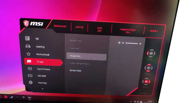 Das Display des MSI Optix MPG321QRFDE-QD ist nahezu randlos, lediglich unten ist ein etwa 2 cm breiter Rand vorhanden. Auf diesem ist mittig das Logo des Herstellers untergebracht. Unterhalb des Logos finden wir den Sensor, der die Bildschirmhelligkeit an die Umgebung anpassen kann. Das Display selbst ist matt gehalten, was störende Reflexionen mindern soll.
