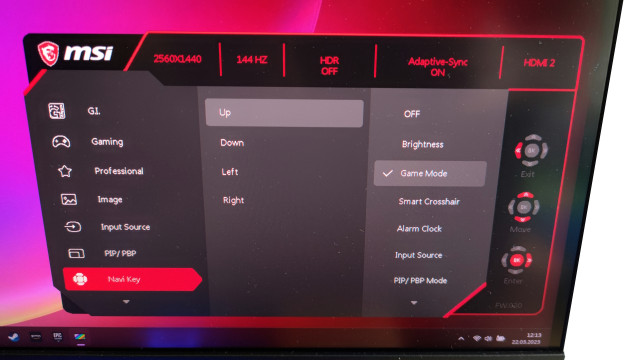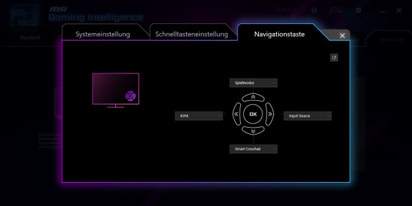 Alle Einstellungen lassen sich auch über das Bildschirmmenü (OSD) erledigen. Dabei gibt es sogar die Möglichkeit, den Minijoystick auf der Rückseite mit vier Makros zu belegen. Zusätzlich gibt es an der rechten Unterkante eine weitere Makrotaste. Die Bedienung über den Mini Joystick fühlt sich etwas schwammig an, sodass wir die Bedienung über die Software dann doch bevorzugen.