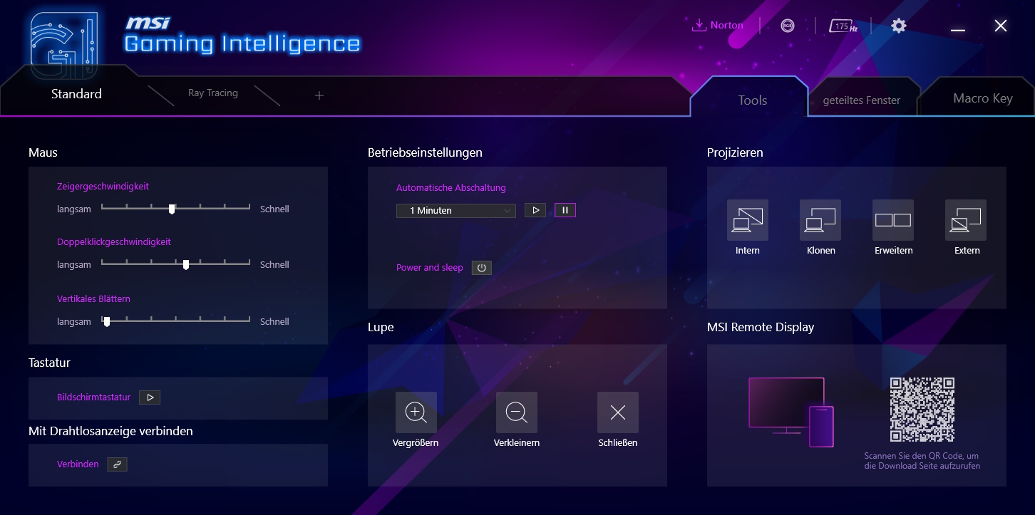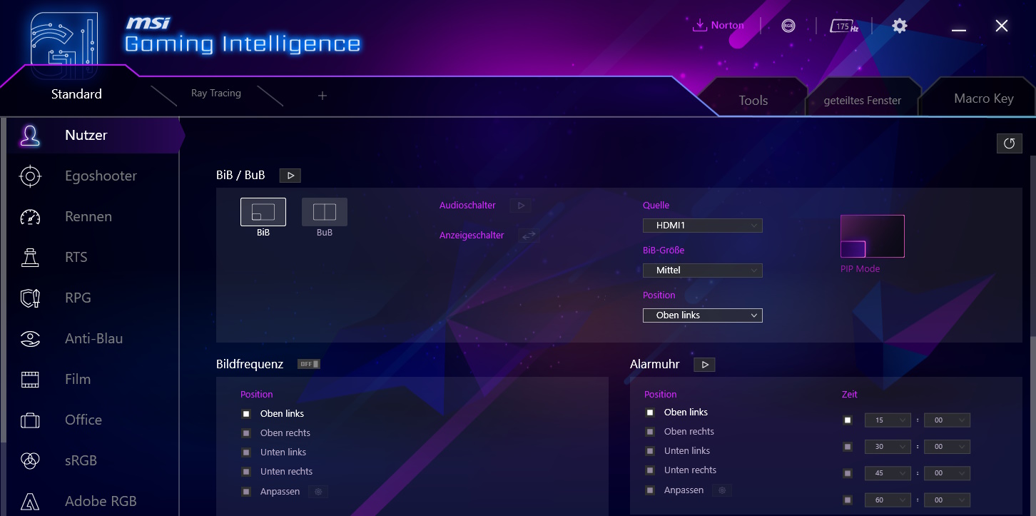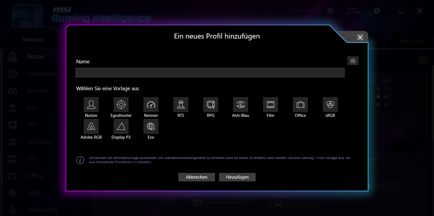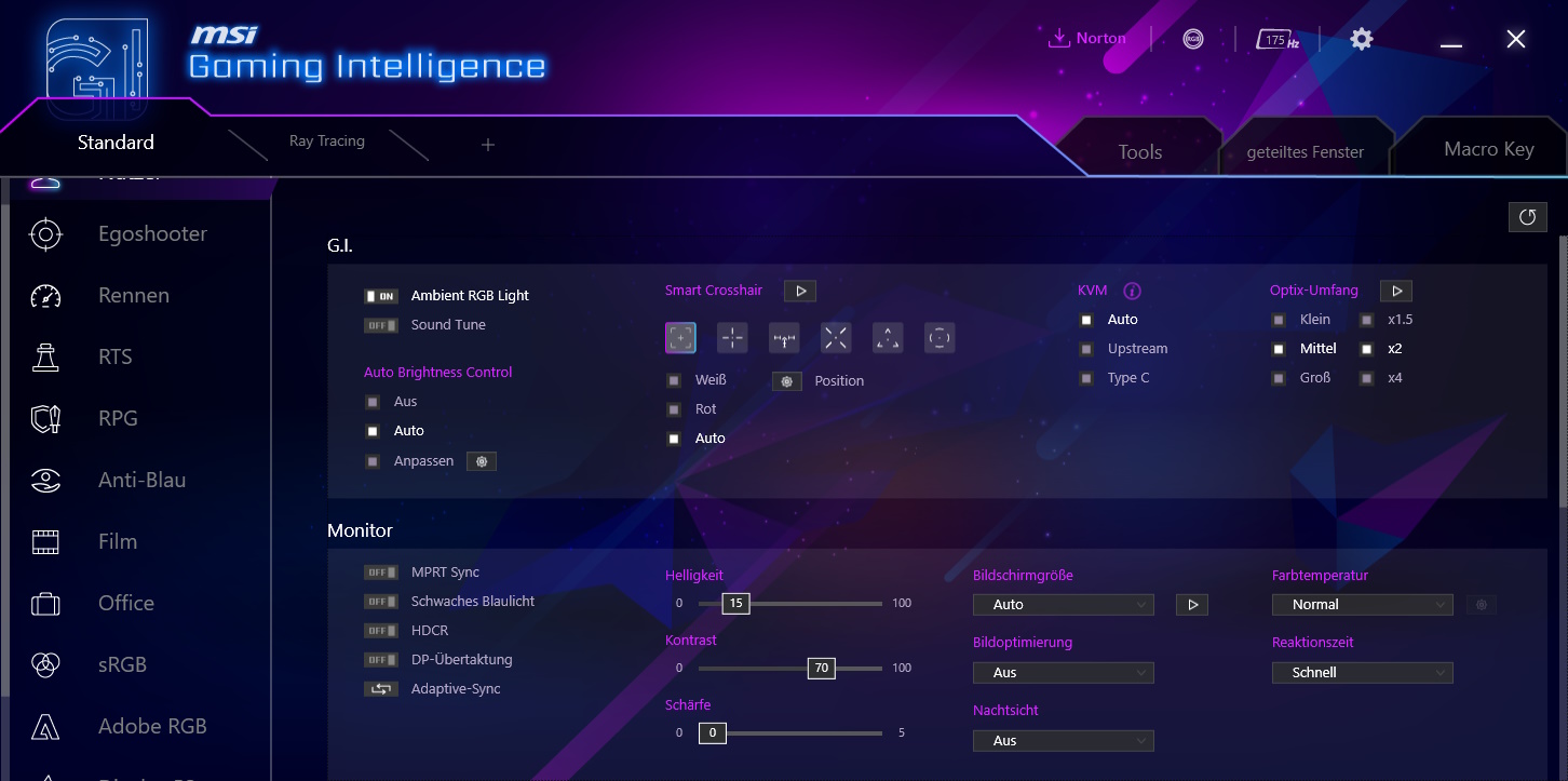 MSI bietet für den MSI Optix MPG321QRFDE-QD mehrere Möglichkeiten der Steuerung und Anpassung, die wohl wichtigste Software zum Betrieb des Monitors ist „MSI Gaming Intelligence“. Die Software ist ziemlich verschachtelt, aber trotzdem noch intuitiv zu bedienen. Nachdem Start gelangen wir in den Reiter „Standard“. Hier sehen wir links 12 Profile, die jeweils einem bestimmten Szenario bzw. Spielegenre zugeordnet sind. Hier lassen sich sehr viele Einstellungen vornehmen, die sonst umständlich über das OSD gemacht werden müssten. Es lässt sich auch ein Profil mit eigenen Einstellungen anfertigen. Weiter finden wir auch einen QR Code, der uns dabei hilft, die App zur Steuerung des Monitors via Smartphone zu steuern. Was uns allerdings stört, ist die Tatsache, dass die MSI Gaming Intelligence uns bei jedem Windows-Start dazu auffordert, dass wir doch eine Sicherheitssuite von Norton installieren möchten.