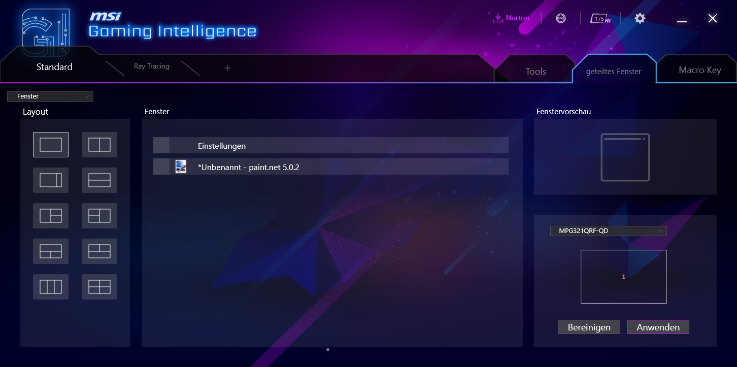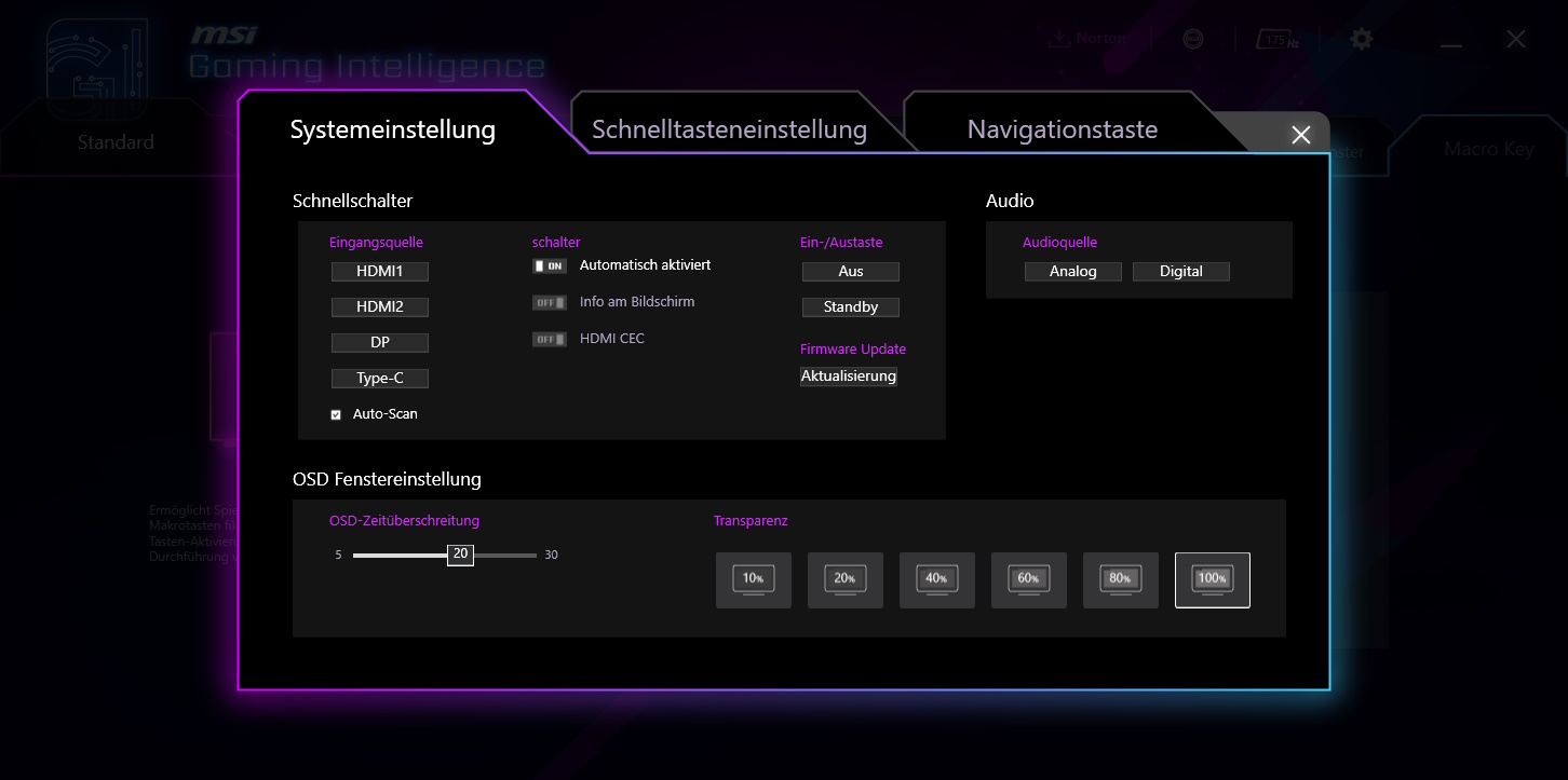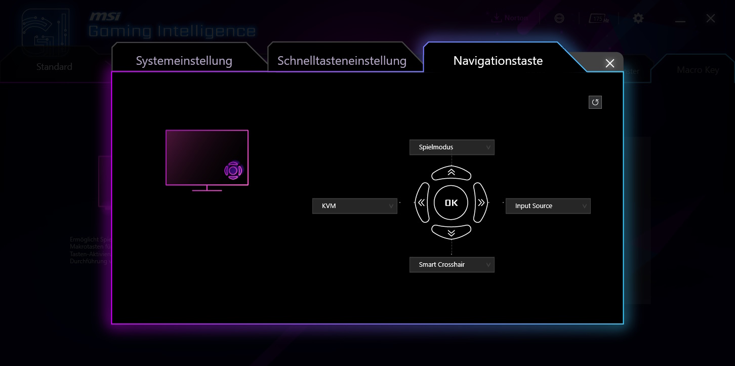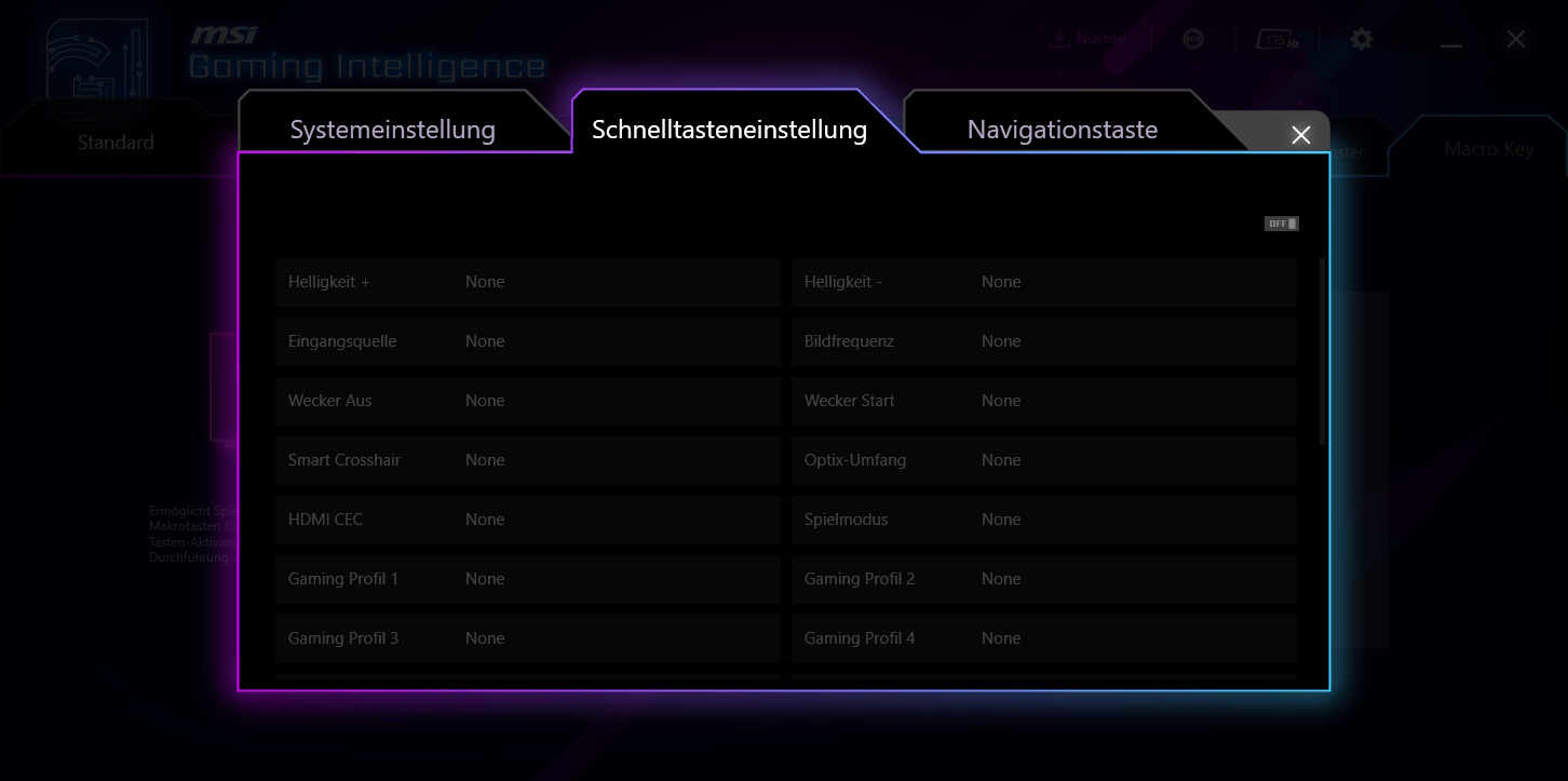 MSI bietet für den MSI Optix MPG321QRFDE-QD mehrere Möglichkeiten der Steuerung und Anpassung, die wohl wichtigste Software zum Betrieb des Monitors ist „MSI Gaming Intelligence“. Die Software ist ziemlich verschachtelt, aber trotzdem noch intuitiv zu bedienen. Nachdem Start gelangen wir in den Reiter „Standard“. Hier sehen wir links 12 Profile, die jeweils einem bestimmten Szenario bzw. Spielegenre zugeordnet sind. Hier lassen sich sehr viele Einstellungen vornehmen, die sonst umständlich über das OSD gemacht werden müssten. Es lässt sich auch ein Profil mit eigenen Einstellungen anfertigen. Weiter finden wir auch einen QR Code, der uns dabei hilft, die App zur Steuerung des Monitors via Smartphone zu steuern. Was uns allerdings stört, ist die Tatsache, dass die MSI Gaming Intelligence uns bei jedem Windows-Start dazu auffordert, dass wir doch eine Sicherheitssuite von Norton installieren möchten.