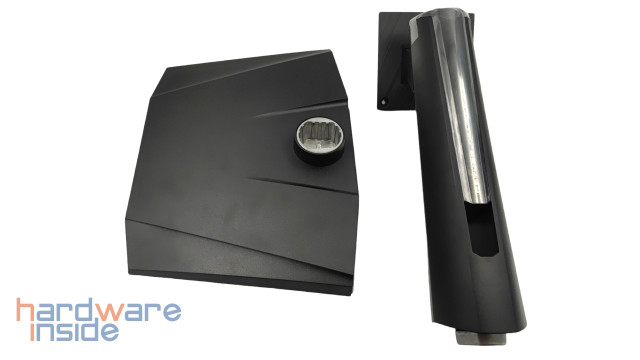 Wir werfen einen genaueren Blick auf den Standfuß des MSI Optix MPG321UR-QD. Auch dieser besteht aus zwei Teilen, dem Fuß und dem Arm. Beide werden über eine zentrale Schraube im Fuß miteinander verbunden, welche sich ohne Werkzeug festziehen lässt. Anschließend wird der Monitor eingehängt und mittels zweier Schrauben fixiert.