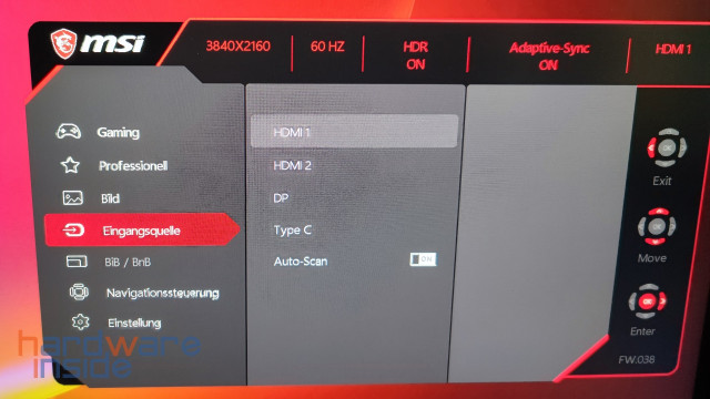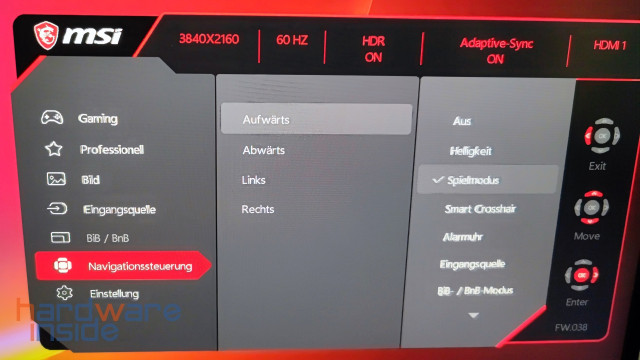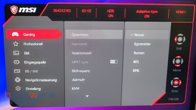 Das OSD Menü des MSI Optix MPG321UR-QD ist gewohnt übersichtlich und lässt sich dank des kleinen Joysticks einfach bedienen. Es ist klar strukturiert und Funktionen lassen sich schnell finden. Sehr gut gefällt uns hier, dass das Menü an der oberen Kante darüber informiert, welche Hauptfunktionen bereits aktiviert beziehungsweise wie diese eingestellt sind.