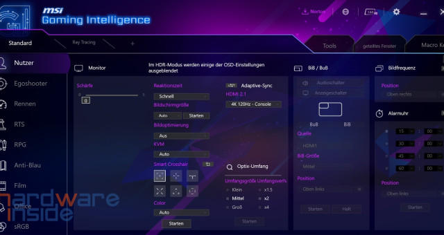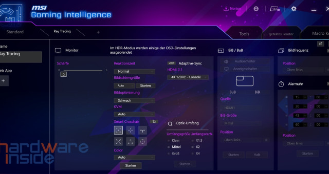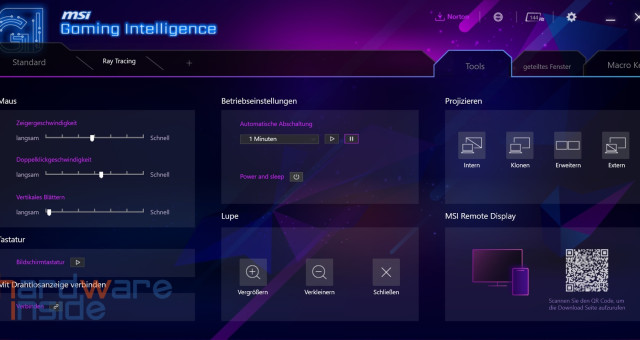 Auch beim MSI Optix MPG321UR-QD gibt es mehrere Möglichkeiten der Steuerung und Anpassung. Die wohl wichtigste Software zum Betrieb des Monitors ist „MSI Gaming Intelligence“. Die Software ist verschachtelt, aber trotzdem noch intuitiv zu bedienen. Nach dem Start gelangen wir in den Reiter „Standard“. Hier sehen wir links 12 Profile, die jeweils einem bestimmten Szenario bzw. Spielegenre zugeordnet sind. Hier lassen sich sehr viele Einstellungen vornehmen, die sonst umständlich über das OSD gemacht werden müssten. Es lässt sich auch ein Profil mit eigenen Einstellungen anfertigen. Weiter finden wir auch einen QR-Code, der uns dabei hilft, die App zur Steuerung des Monitors via Smartphone zu steuern. Was uns allerdings stört, ist die Tatsache, dass die MSI Gaming Intelligence uns bei jedem Windows-Start dazu auffordert, dass wir doch eine Sicherheitssuite von Norton installieren möchten.