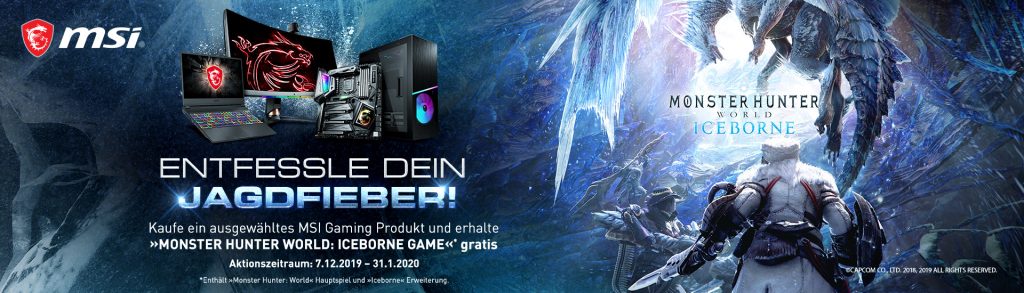 Taipeh/Frankfurt am Main, 09.12.2019 – MSI, weltweit führender Anbieter für Gaming-Hardware, kündigt das Spielepaket „Entfessele dein Jagdfieber!“ an. Beim Kauf ausgewählter MSI Produkte gibt es das Monster Hunter: World Hauptspiel sowie die Erweiterung Monster Hunter World: Iceborne gratis dazu. Die Bundle-Aktion startet am 07. Dezember 2019 und endet am 21. Januar 2020.