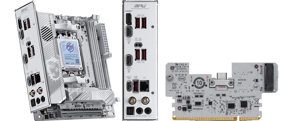 Mit 5G LAN und schnellem Wi-Fi 7 bietet das Mainboard sehr schnelle und stabile Verbindungen für Gaming und Content Creation. Am rückseitigen I/O Panel stehen zwei USB 4 Type-C Anschlüsse mit DisplayPort-Ausgabe zur Verfügung, die hohe Datenraten, Unterstützung für moderne Peripherie und Bildausgabe über ein einziges Kabel ermöglichen. Trotz des kleinen ITX-Formfaktors legt MSI dem MPG X870I EDGE TI EVO WIFI zudem eine kompakte Erweiterungskarte bei. Diese bietet zusätzliche Anschlüsse, darunter einen USB Type-C 20 Gbps Port mit 27 W Power Delivery für schnelles Laden, einen PCIe 4.0 x4 M.2 Slot sowie weitere SATA Ports für zusätzlichen Speicherbedarf.