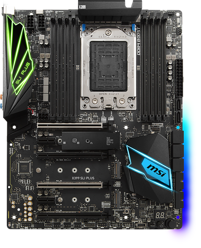 Frankfurt am Main / Taipeh, 09.10.2017 – MSI stellt mit dem X399 SLI PLUS ein neues Motherboard für AMD Ryzen Threadripper-Prozessoren vor. Das MSI X399 SLI PLUS mit TR4-Sockel ist ein optimiertes Motherboard für Workstations, das speziell für den professionellen Einsatz entwickelt wurde. Mit massiven Kühlkörpern, Military-Class-V-Komponenten (Dark-Choke, Dark-Cap, Titanium-Cap) sowie zahlreichen einzigartigen, patentierten Leistungsverbesserungsmerkmalen ist das MSI X399 SLI PLUS die beste Wahl für Systemintegratoren und CAD-/Design-Profis mit hohen Ansprüchen in puncto Leistung und Stabilität.
