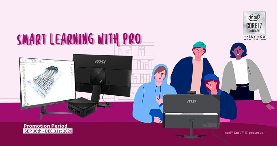 Taipeh / Frankfurt am Main, 02.10.2020 – MSI unterstützt Studenten und Mitarbeiter bei ihrer Arbeit im Home-Office aktuell mit einer attraktiven Smart-Learning-Promo. Käufer von ausgewählten All-in-One-PCs, Mini-PCs und Office-Monitoren aus der MSI Pro-Serie erhalten im Aktionszeitraum bis Jahresende 2020 einen kostenfreien Bluetooth-Lautsprecher von MSI. Studenten winkt exklusiv eine hochwertige MSI Webcam. Voraussetzung ist der Upload eines gültigen Studentenausweises im MSI-Portal und der Kauf eines der Aktionsprodukte. Im Rahmen der Smart-Learning-Promo stehen unter anderem 22“- und 24“-All-in-One-PCs aus der Pro-Serie von MSI zur Auswahl. Die PRO 24X Serie überzeugt durch ein ultraflaches Design mit schlanken 6,5 mm. Damit ist das Display fast doppelt so dünn wie ein Standard-AIO-PC. Der schlichte Standfuß ergänzt das ultraflache Display auf elegante Weise, während das Finish aus gebürstetem Metall auf der Rückseite für ein stilvolles und zeitgemäßes Design sorgt.  Zu den Aktionsprodukten zählen auch zwei Cubi Mini-PCs sowie drei verschiedene MSI Office-Monitore (Pro MP241, Pro MP242 und Pro MP221).