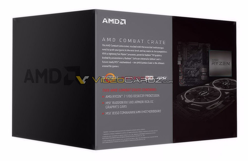 Diese Combat-Kisten bestehen aus einem Ryzen 5 1600 oder Ryzen 7 1700 Prozessor, einem MSI B350 Tomahawk Motherboard und nicht zuletzt einer MSI RX 580 Armor Grafikkarte. Da die Prozessoren der Ryzen 2000-Serie bereits auf dem Markt sind und die B450-Motherboards wahrscheinlich auf dem Weg sind, besteht das primäre Ziel dieser Partnerschaft wahrscheinlich darin, dass beide Unternehmen ihre Aktien der letzten Generation auflösen. Die Beschreibung auf der Verpackung lautet: