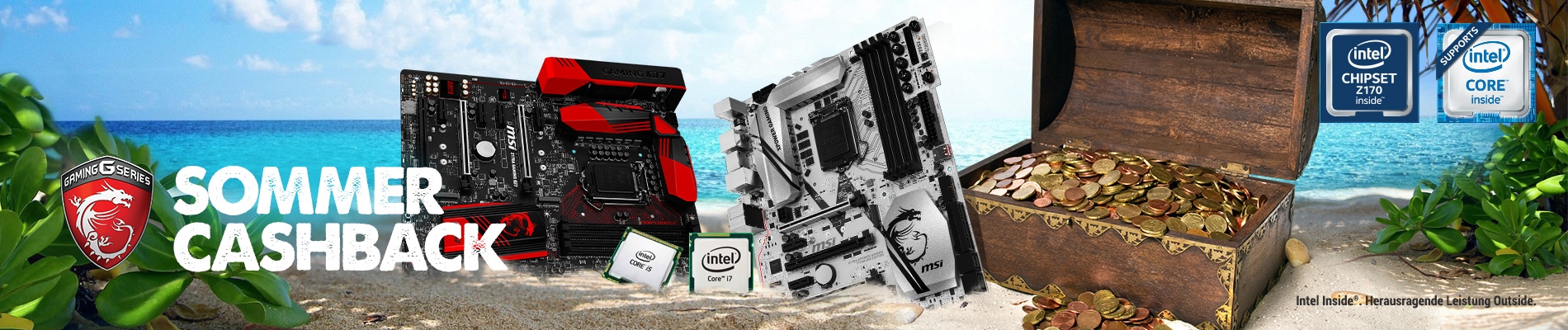 Frankfurt am Main / Taipeh, 13.06.2016 – Intel und MSI starten mit einer gemeinsamen Cashback-Aktion in den Sommer. Wer bis zum 15. Juli eine Intel-CPU und eines der zur Auswahl stehenden MSI-Motherboards erwirbt, profitiert nicht nur von hervorragender Performance und perfekter Kompatibilität, sondern kann sich auch einen zusätzlichen Cashback-Bonus sichern. Je nach Kombination von MSI-Motherboard und Intel-Prozessor winken Nachlässe von bis zu 145,- Euro.